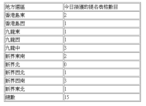 各地方選區接獲的提名表格數目如下: