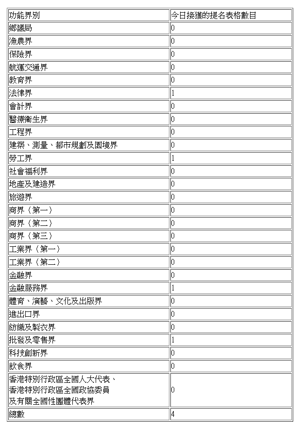 選舉委員會界別今日接獲的提名表格數目為4份。