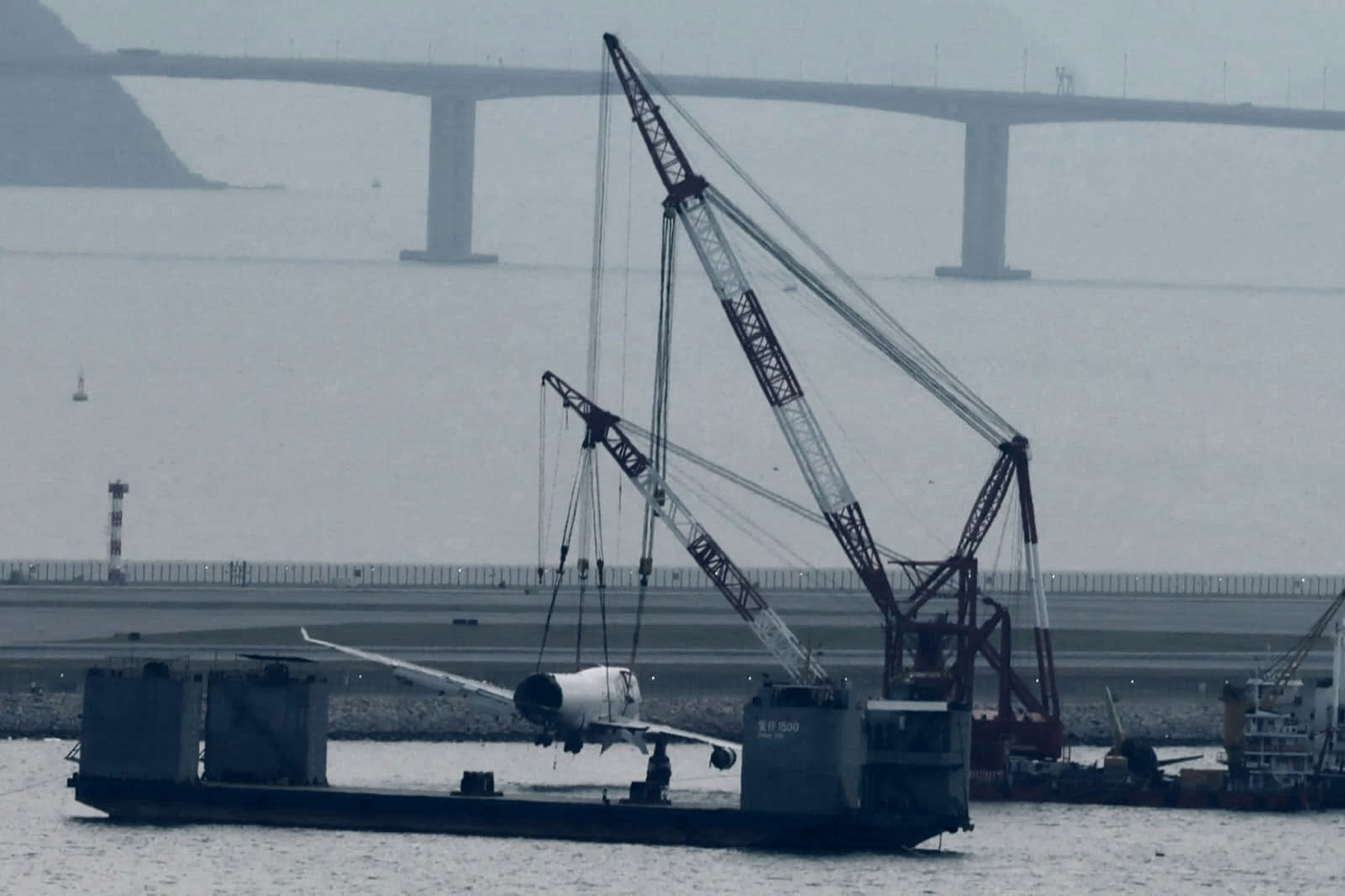 (有片)機場貨機事故|「最大件」機身連機頭殘骸成功吊起載走 機管局料明晚完成所有打撈工作