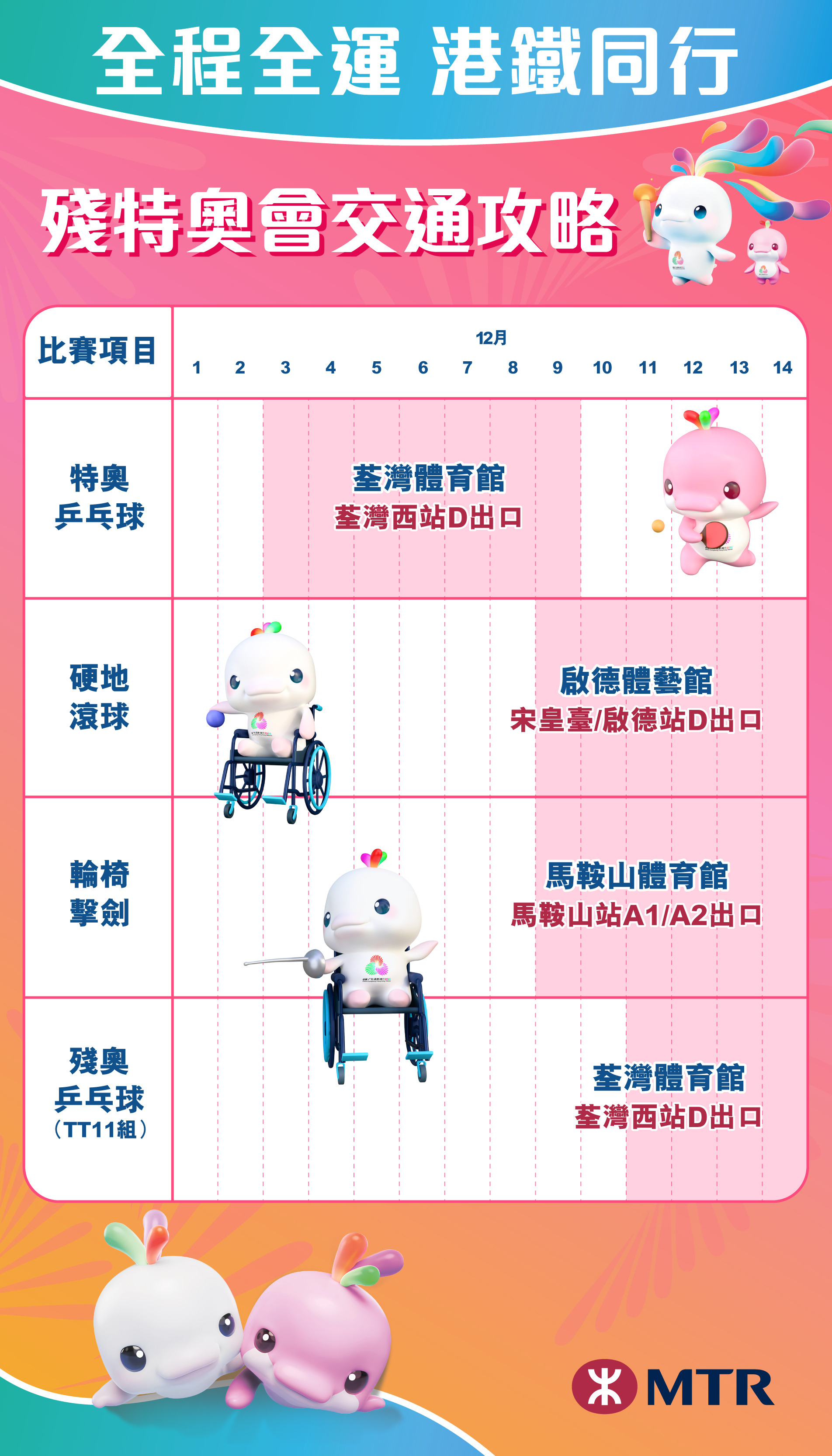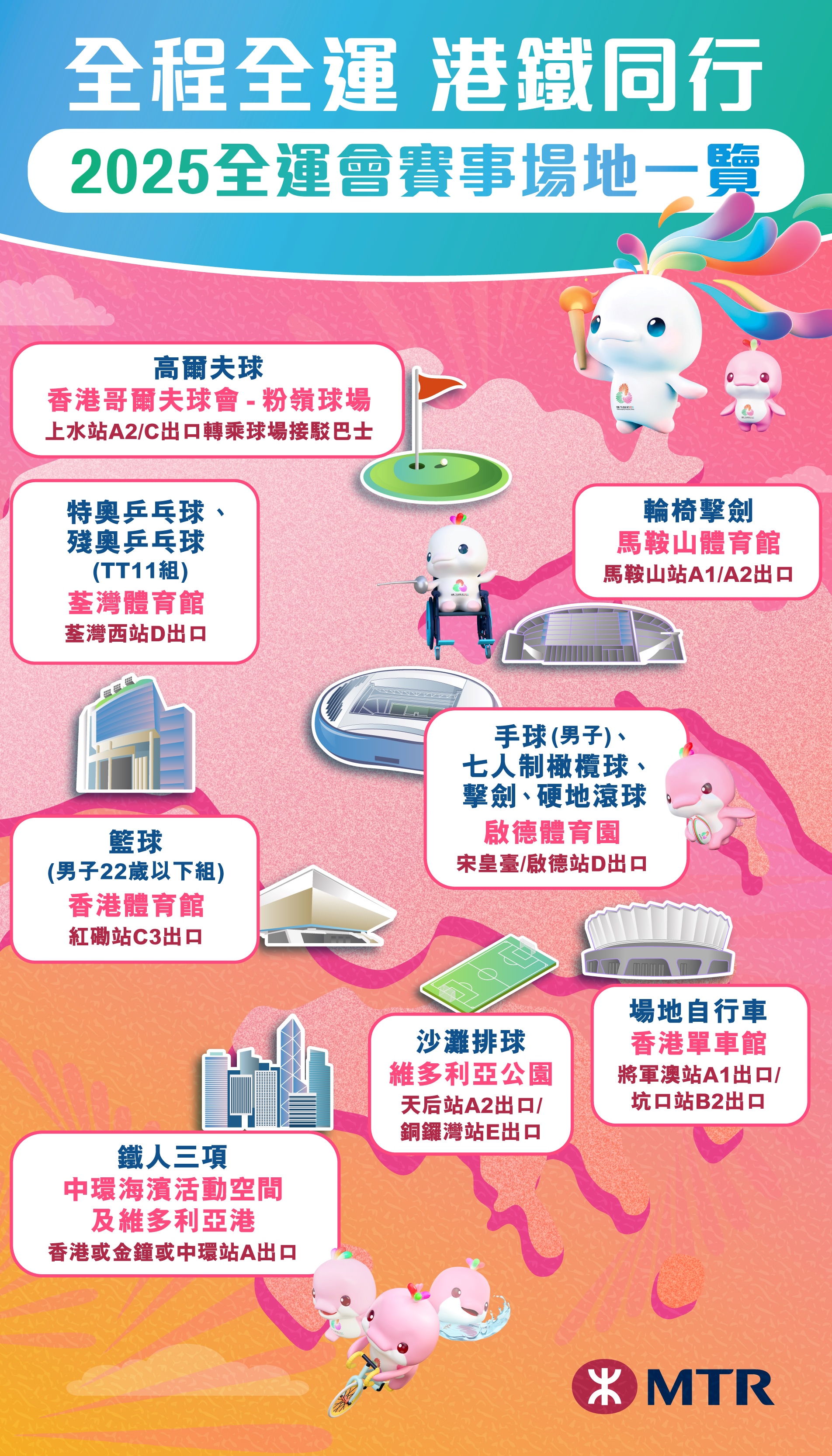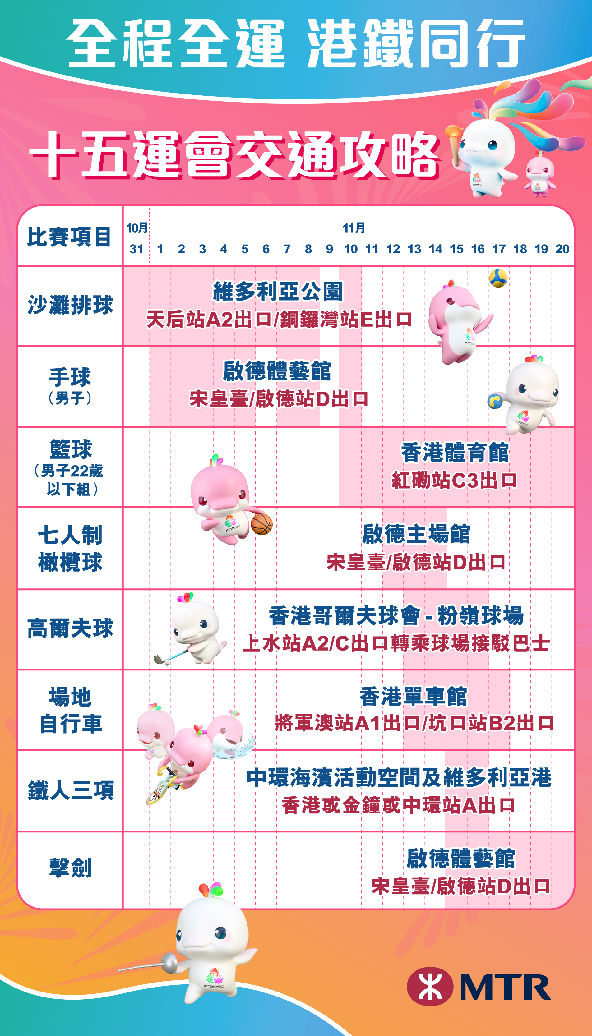 港鐵指,為配合賽事日程,由本周五(31日)起,會率先於15個鄰近賽事場地(包括中環、銅鑼灣、紅磡、啟德及上水站等)和位於口岸的車站(即羅湖、落馬洲及高鐵香港西九龍站),安排超過50名「服務大使」,解答乘客查詢及提供出行建議等。這些車站亦會增加標示及前往場地的相關資訊。港鐵虛擬服務大使Tracy會在特定車站向乘客提供全運會資訊。