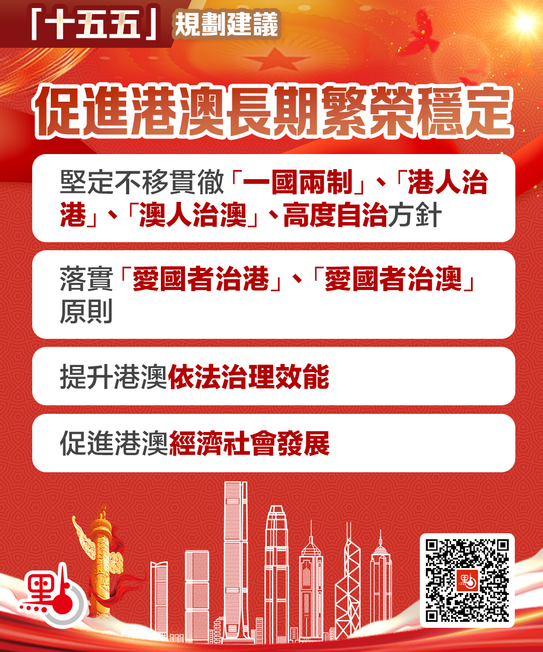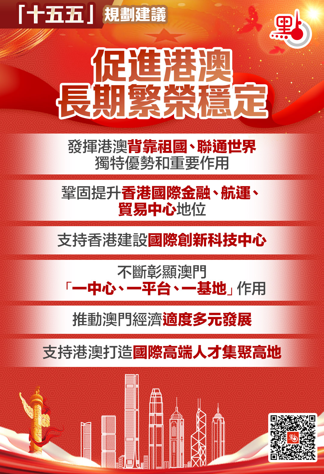 (58)促進香港、澳門長期繁榮穩定。堅定不移貫徹「一國兩制」、「港人治港」、「澳人治澳」、高度自治方針,落實「愛國者治港」、「愛國者治澳」原則,提升港澳依法治理效能,促進港澳經濟社會發展。支持港澳更好融入和服務國家發展大局,加強港澳與內地經貿、科技、人文等合作,完善便利港澳居民在內地發展和生活政策措施。發揮港澳背靠祖國、聯通世界獨特優勢和重要作用,鞏固提升香港國際金融、航運、貿易中心地位,支持香港建設國際創新科技中心,不斷彰顯澳門「一中心、一平台、一基地」作用,推動澳門經濟適度多元發展,支持港澳打造國際高端人才集聚高地。