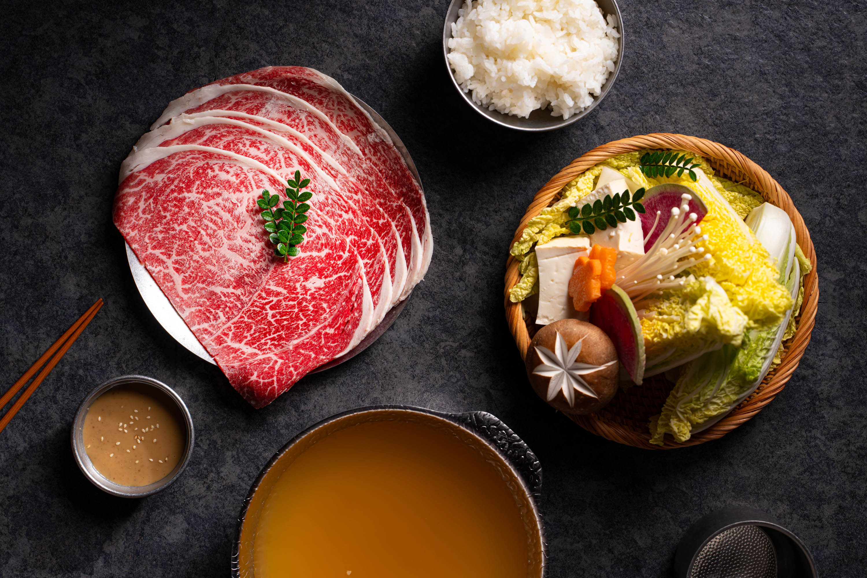 港人最愛的涮涮鍋與壽喜燒當然少不了!$158起即可享用180g北海道千歲米豚套餐,亦有各位牛魔王最愛的日本和牛,包括油脂含量較低、肉質結實的赤身,油花均勻分布的霜降部位及入口多汁飽滿的肉眼部位。餐廳更提供6款湯底可供搭配,包括清爽昆布和濃厚關西風壽喜燒風味。