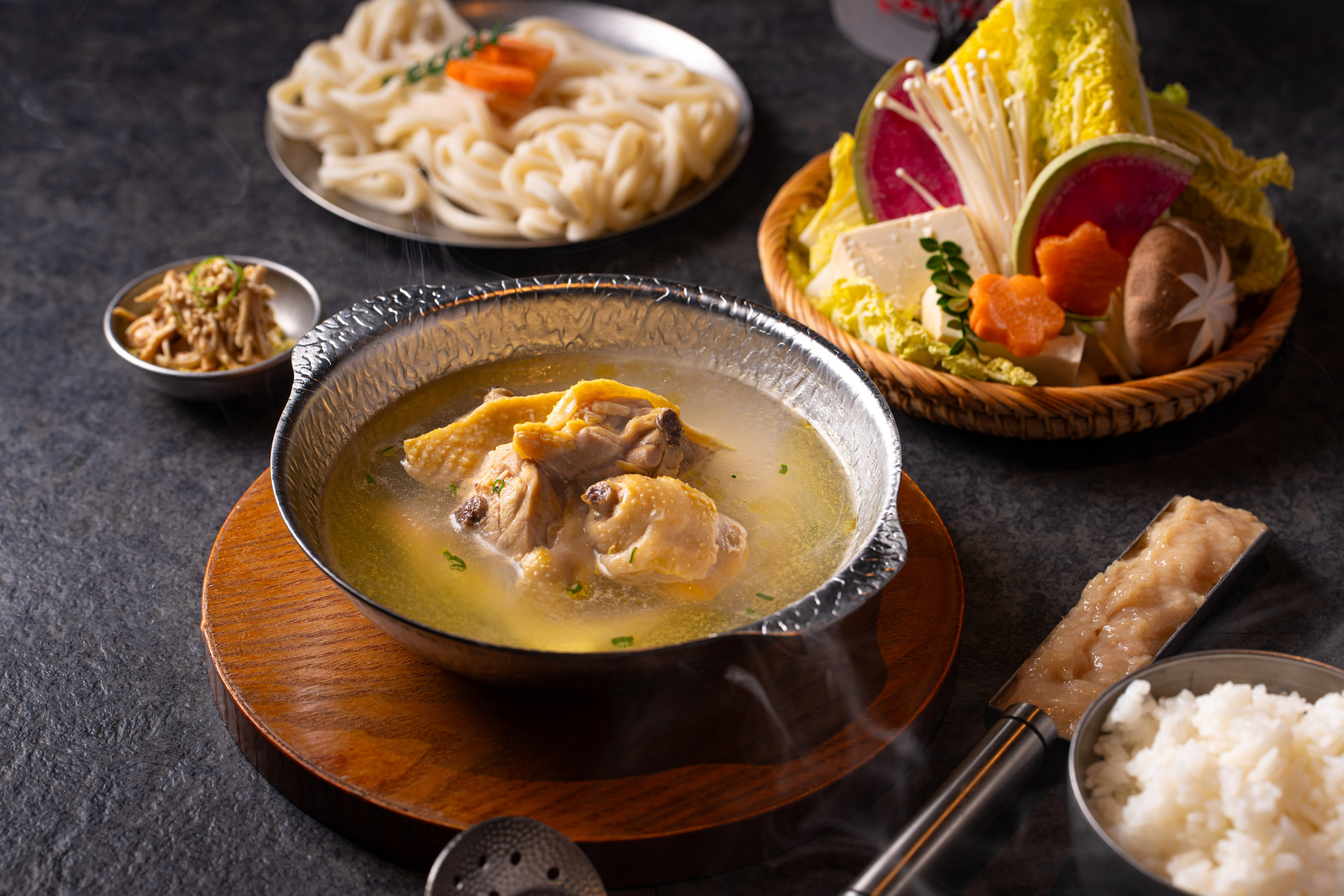 HAKATANABE特意選用日本進口博多地雞,不僅具備地雞獨有的彈牙勁道,肉質更細膩帶有脆度,咀嚼間能釋放源源不絕的鮮香。所有雞隻以放養方式飼養至少75日,確保入口的每一口肉質都純淨而美味。餐廳嚴選博多地雞雞骨,以慢火熬煮8小時以上,入口醇厚回甘而不膩。傳統食法:先品嘗前菜芝麻醬雞胸,喝上一碗暖胃雞湯,再享嫩滑雞腿與彈牙雞肉丸。最後再以白飯煮成濃稠的雜炊粥,或以暖心雞湯烏冬作結。