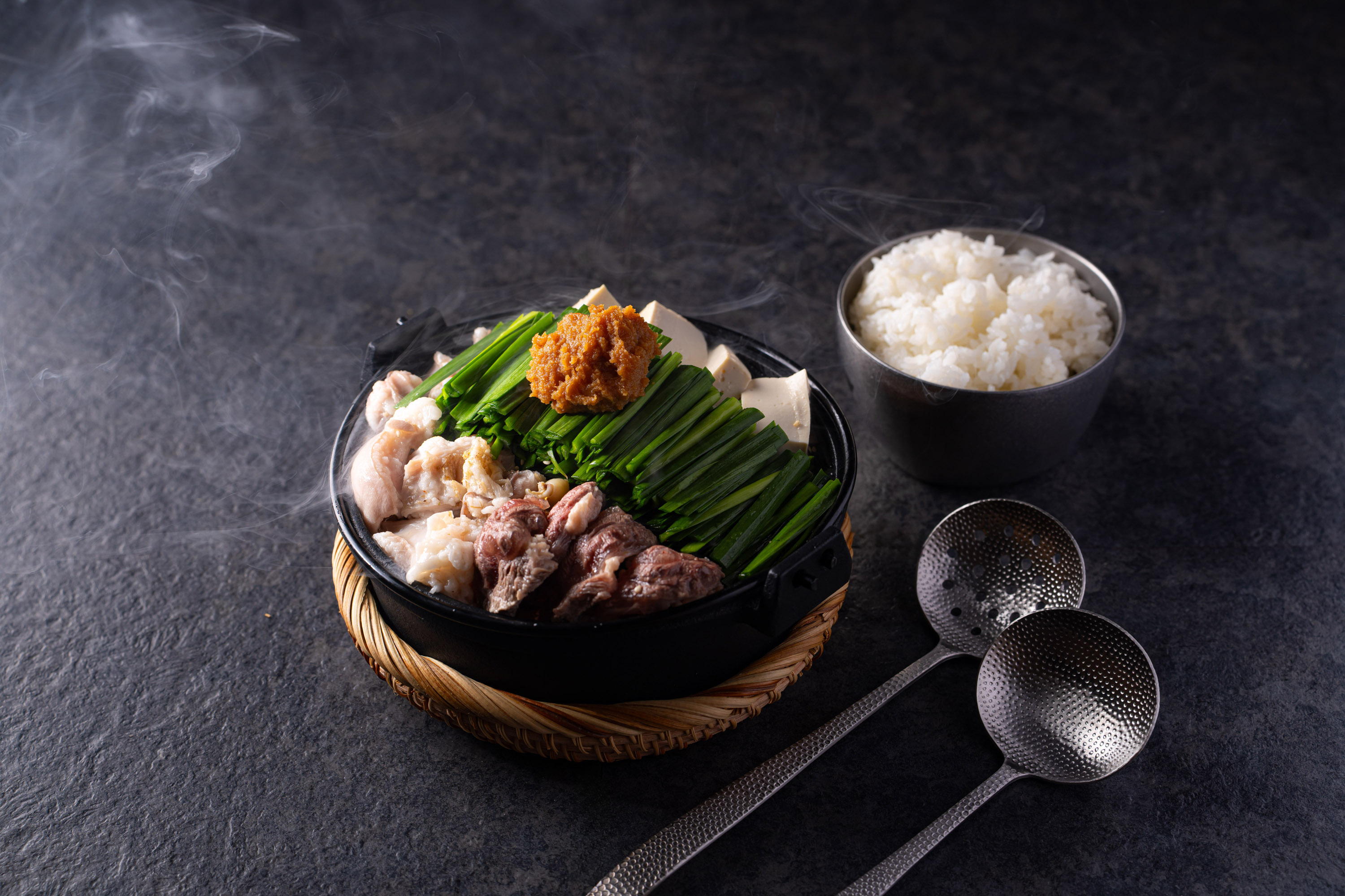 牛腸鍋精髓在於牛內臟的選材與湯底搭配。HAKATANABE嚴選來自九州的優質牛腸,油脂豐潤卻不油膩,餐廳特別準備了3款湯底,帶來截然不同的風味層次。經典牛骨湯乳白濃郁、香氣醇厚;特製味噌湯融合九州與西京味噌,鹹香濃厚;韓式辣醬湯以紅辣椒與發酵大豆製成,帶來辛辣而厚實的風味。