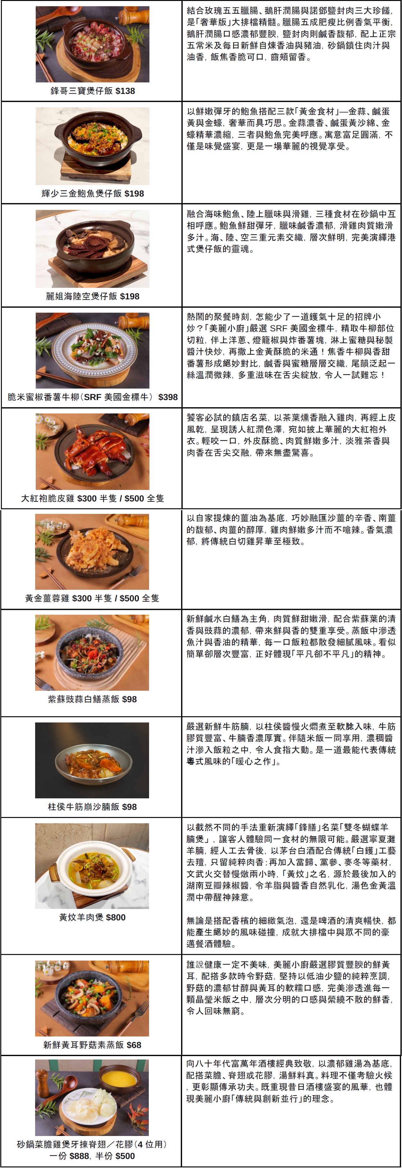 晚市宵夜直落,「美麗小廚」搖身一變成為熱氣騰騰的港式大排檔。餐廳煲仔飯嚴選正宗五常米,配上每日新鮮自煉香油與豬油,當中最矚目的「鋒哥三寶煲仔飯」集玫瑰五五臘腸、鵝肝潤腸與雲南諾鄧鹽封肉於一煲,肥瘦比例拿捏精準,香氣層層交織;另一必試之選「麗姐海陸空煲仔飯」,以鮑魚、滑雞與臘味組成華麗三重奏。鮑魚彈牙鮮甜、滑雞嫩滑多汁、臘味鹹香濃郁,三者在砂鍋中交融出豐富層次。而「輝少三金鮑魚煲仔飯」則以金蒜、鹹蛋黃及金蠔三重黃金食材點綴鮑魚,香濃之中見鮮味深邃。