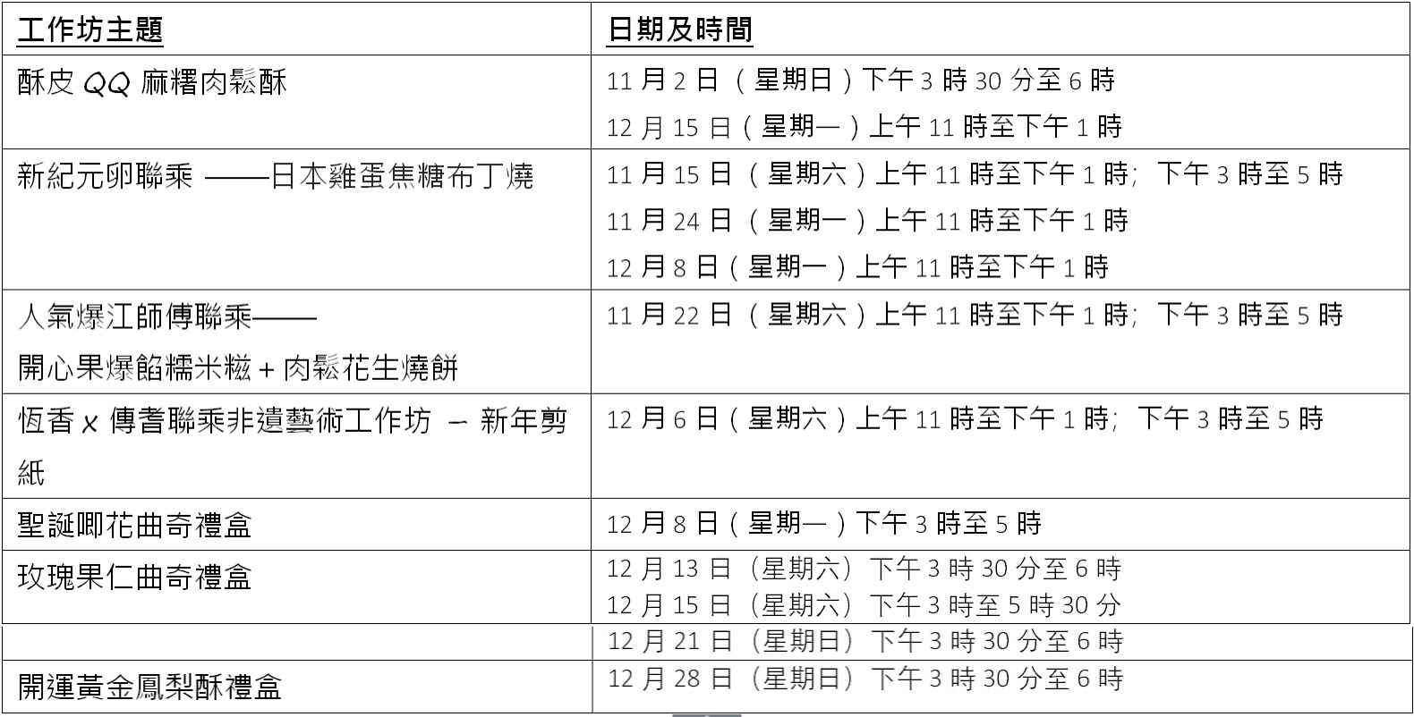 位於旗艦店三樓的「恆香烘焙工作坊」引入互動式體驗空間,讓訪客親身參與餅藝製作及本地工藝創作,課程涵蓋傳統唐餅、新派甜點及非物質文化遺產技藝。參加者可在匠人指導下親手製作多款招牌及創新餅食,11月至12月將率先舉行多個人氣烘培工作坊,亦會聯乘知名人氣品牌推出特色課程,當中包括酥皮QQ麻糬肉鬆酥、人氣「爆江師傅」的開心果爆餡糯米糍及肉鬆花生燒餅、日本雞蛋焦糖布丁燒工作坊,以及聖誕曲奇及玫瑰果仁曲奇禮盒等。恆香亦會定期開班教授製作香酥可口的經典酥餅餅、寓意喜慶的囍餅和節日餅食等,亦有大量新派及造型可愛獨特的烘焙工作坊,讓參加者享受完整製餅體驗,並即場試食自家製作品。所有課程將定期更新,並開放網上報名,歡迎市民及旅客參加,親身感受香港餅藝與工藝文化的創新演繹。點此報名