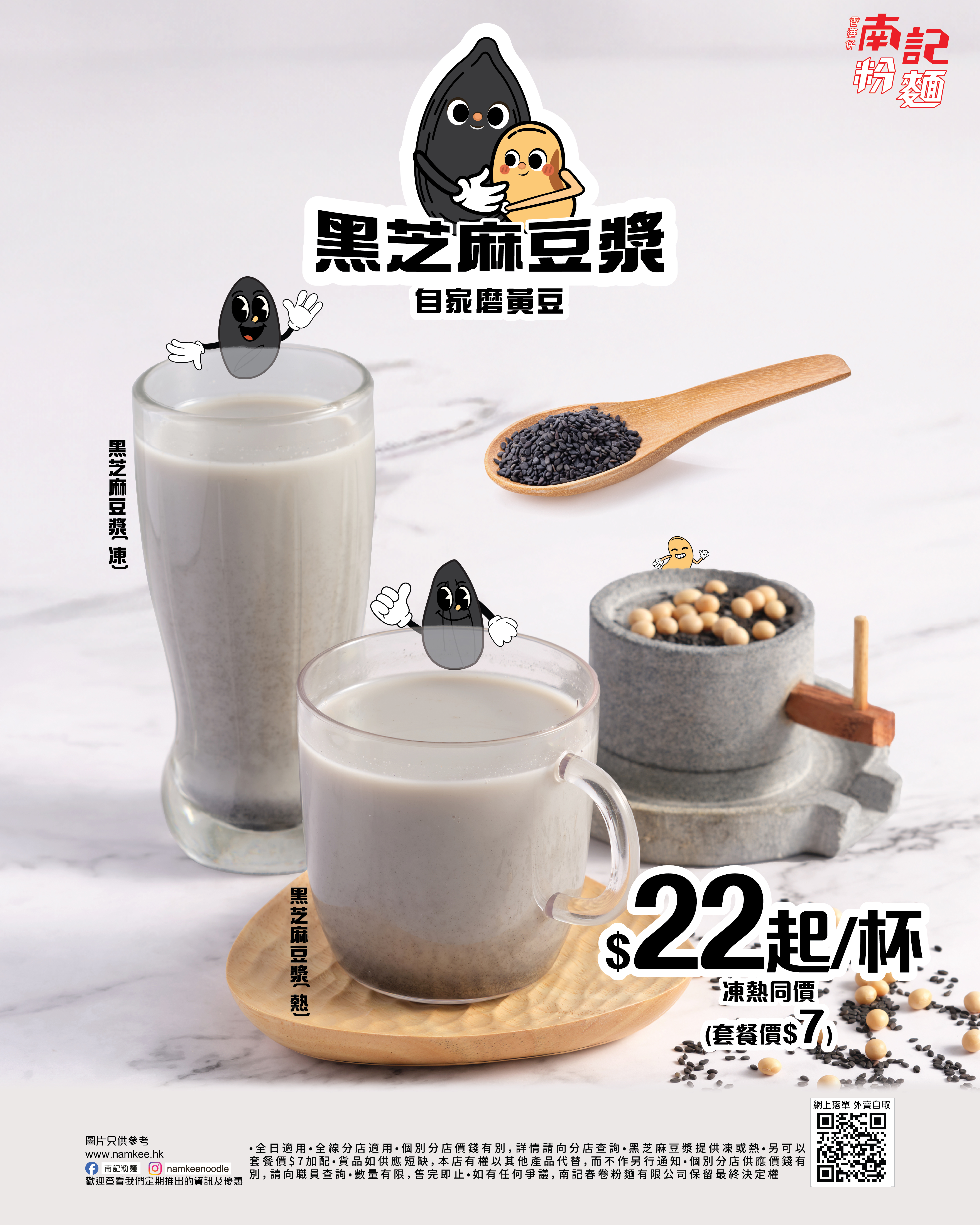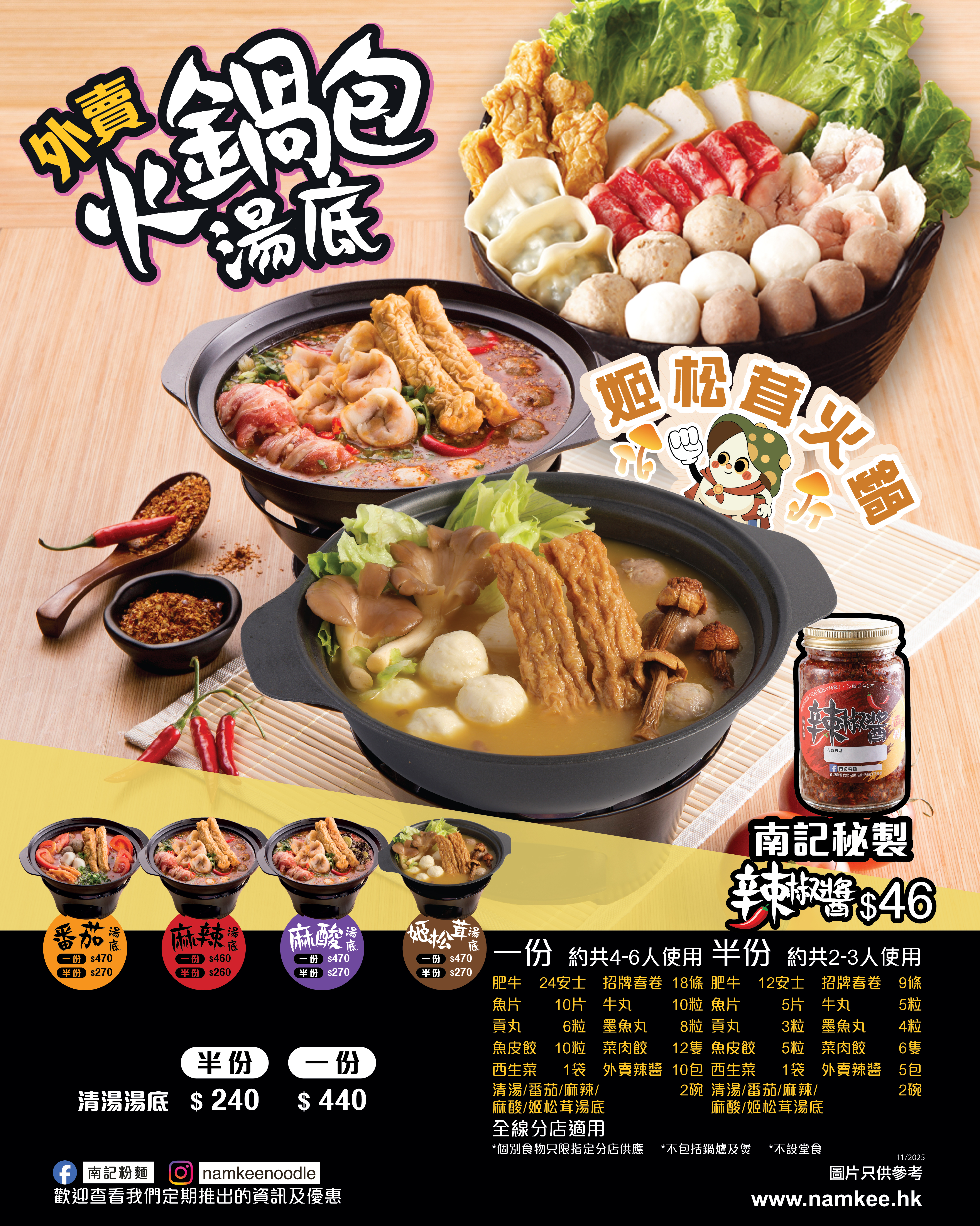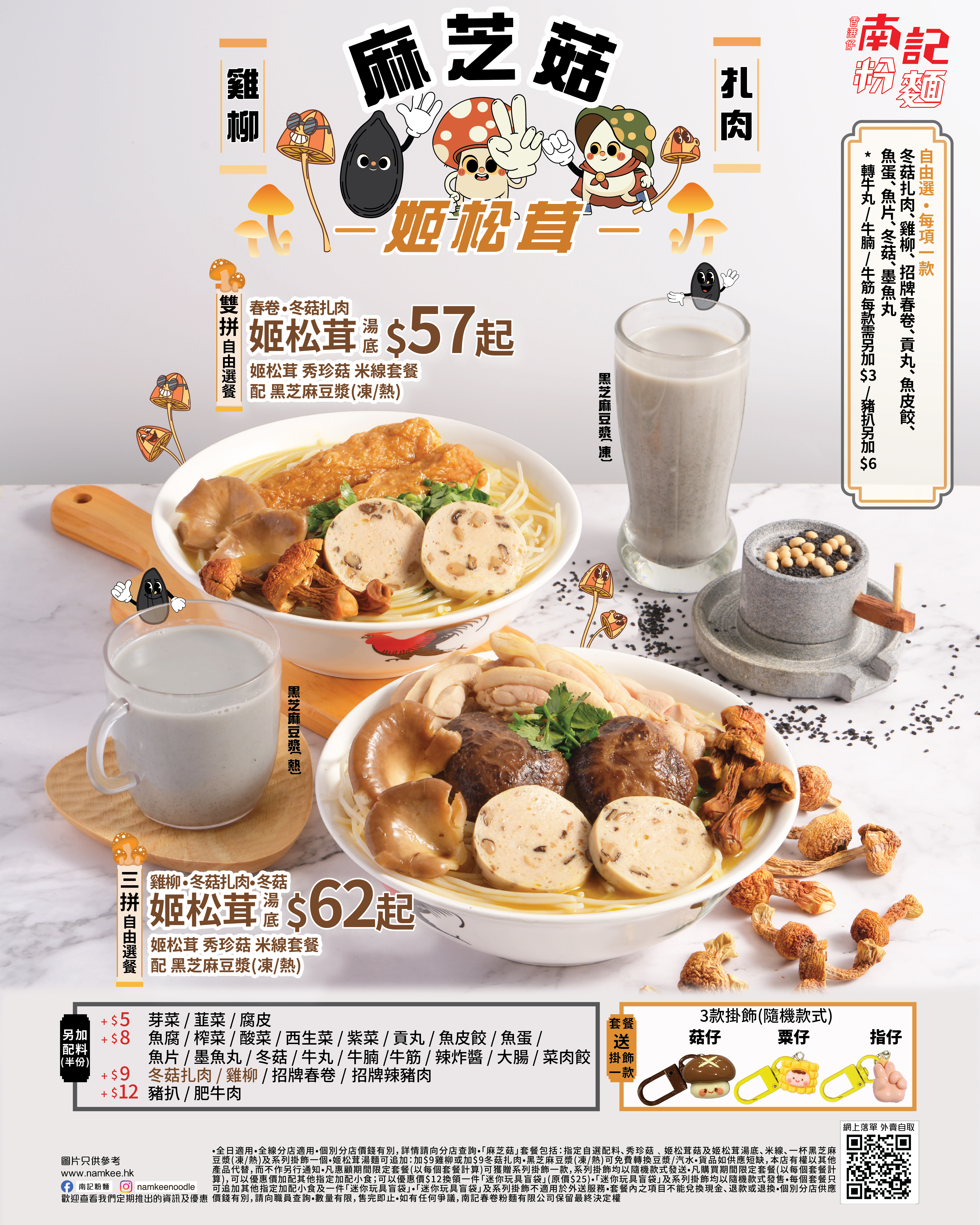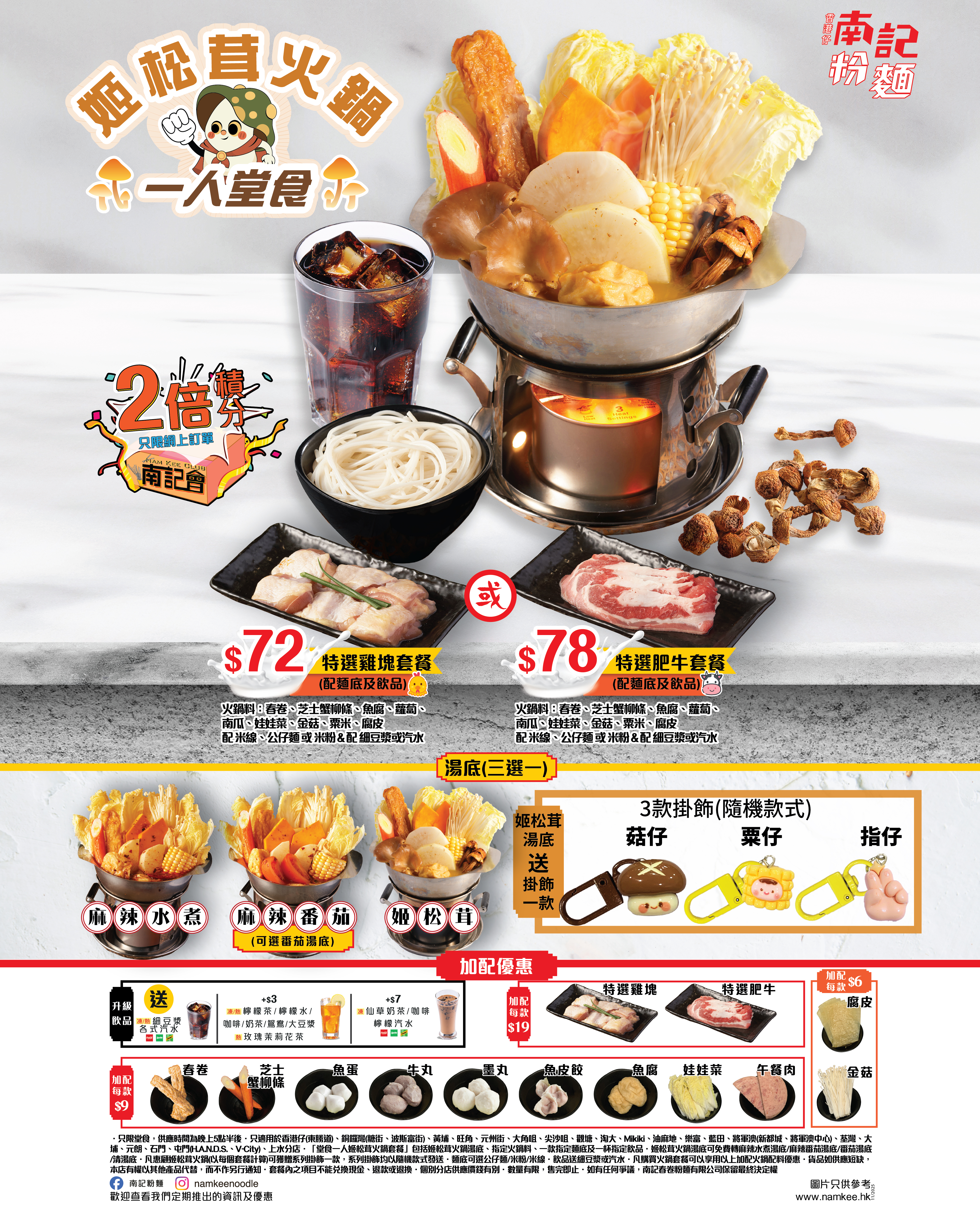 作為保健食用菌之一的姬松茸,除了有益之餘口感脆嫩、別具香醇,「香港仔」南記粉麵特意以其熬製湯底,再以姬松茸及秀珍菇入饌,一眾識食之人當然不可以錯過另外2款全新配料:口感嫩滑的雞柳及爽口彈牙的冬菇扎肉;最後配以自家製的黑芝麻豆漿,獨家配方讓黑芝麻的濃郁與豆漿的香醇完美配合,整個套餐大滿足;另外,惠顧任何「麻芝菇姬松茸米線套餐」即送你萌爆登場的「菇仔」、「粟仔」或「指仔」掛飾一個,可愛模樣絕對令人萌生儲齊一套的衝動!冬天最適合打邊爐,南記粉麵準備了姬松茸火鍋,湯底濃而不膩,配料均沾上姬松茸滋味,吃完再大大口呷一口湯底,絕對是Double滋味,Double快樂!