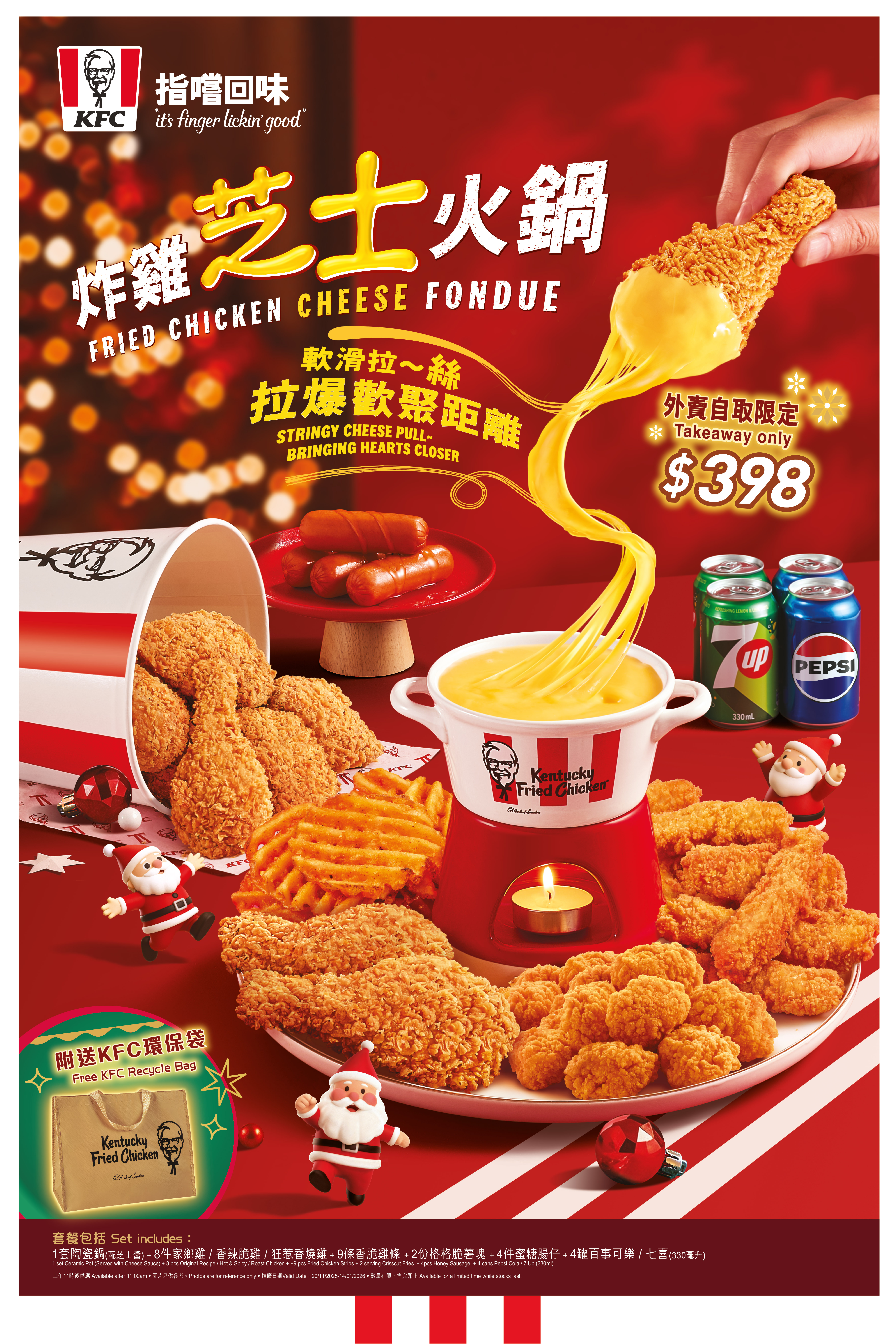 聖誕將至,KFC將推出限定新品必定成為派對美食的焦點,另外萬眾期待的KFC「聖誕派對套餐」四款套餐適用各式聚會今年更有早鳥優惠聖誕套餐買一送一,人均低至37蚊絕對是派對的首選!仲有冬日人氣之選「炸雞芝士火鍋」及「朱古力榛子雲朵葡撻」再度強勢回歸,今年聖誕絕對歡樂滋味滿滿!