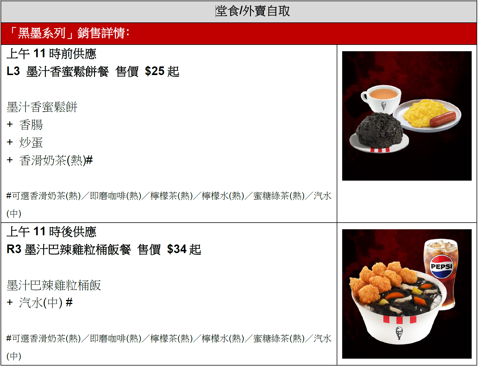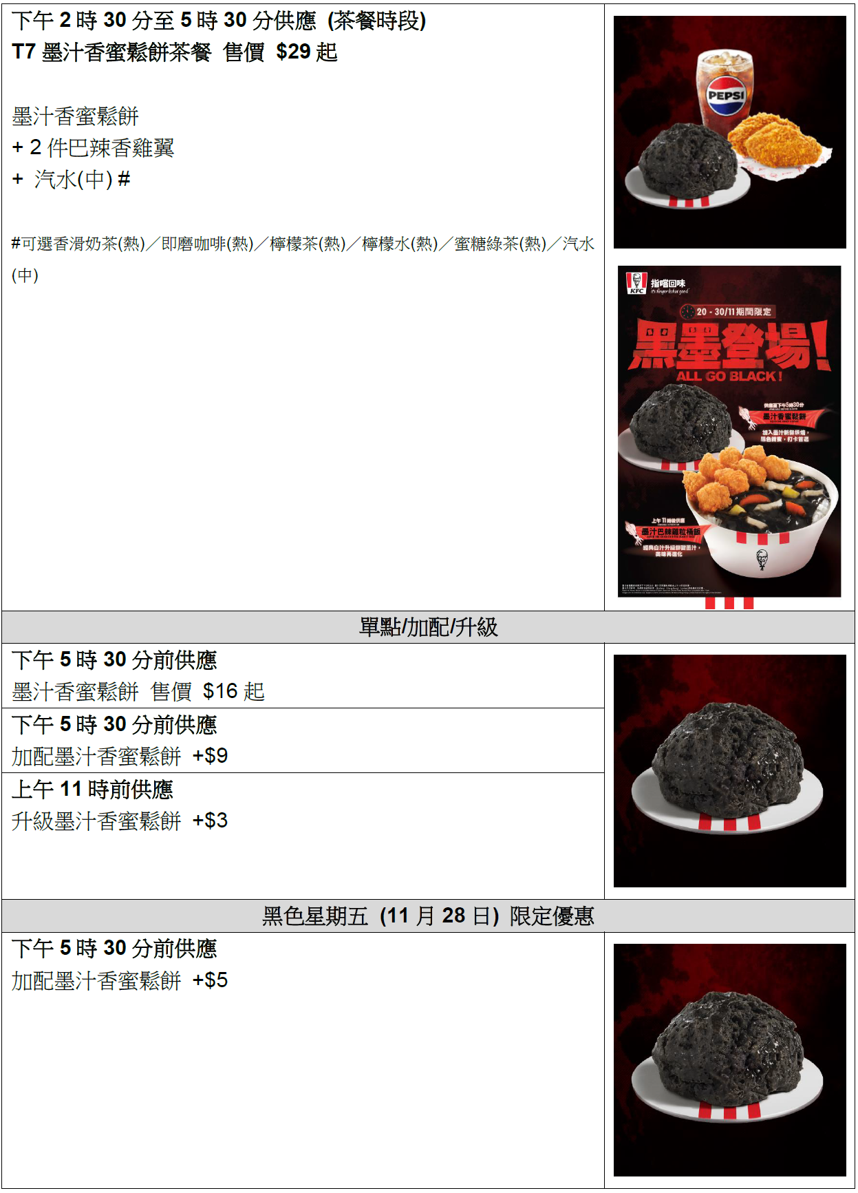 為迎接一年一度的黑色星期五熱潮,KFC由11月20日起特別推出全新「黑墨系列」,帶來早餐至下午茶時段供應的$34「墨汁香蜜鬆餅茶餐」及上午11時後供應的「墨汁巴辣雞粒桶飯」。KFC更將於11月28日黑色星期五當天推出激荀優惠,當日惠顧KFC並只需$5即可以套餐加配價加購是次新推出的「墨汁香蜜鬆餅」!