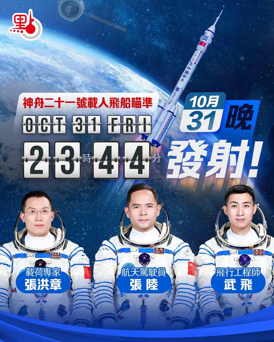 【點新聞報道】據央視新聞報道,神舟二十一號瞄準10月31日23時44分發射。執行神舟二十一號載人飛行任務的航天員乘組由張陸、武飛、張洪章3名航天員組成,張陸擔任指令長。一起來認識下即將進入太空的3名航天員吧!