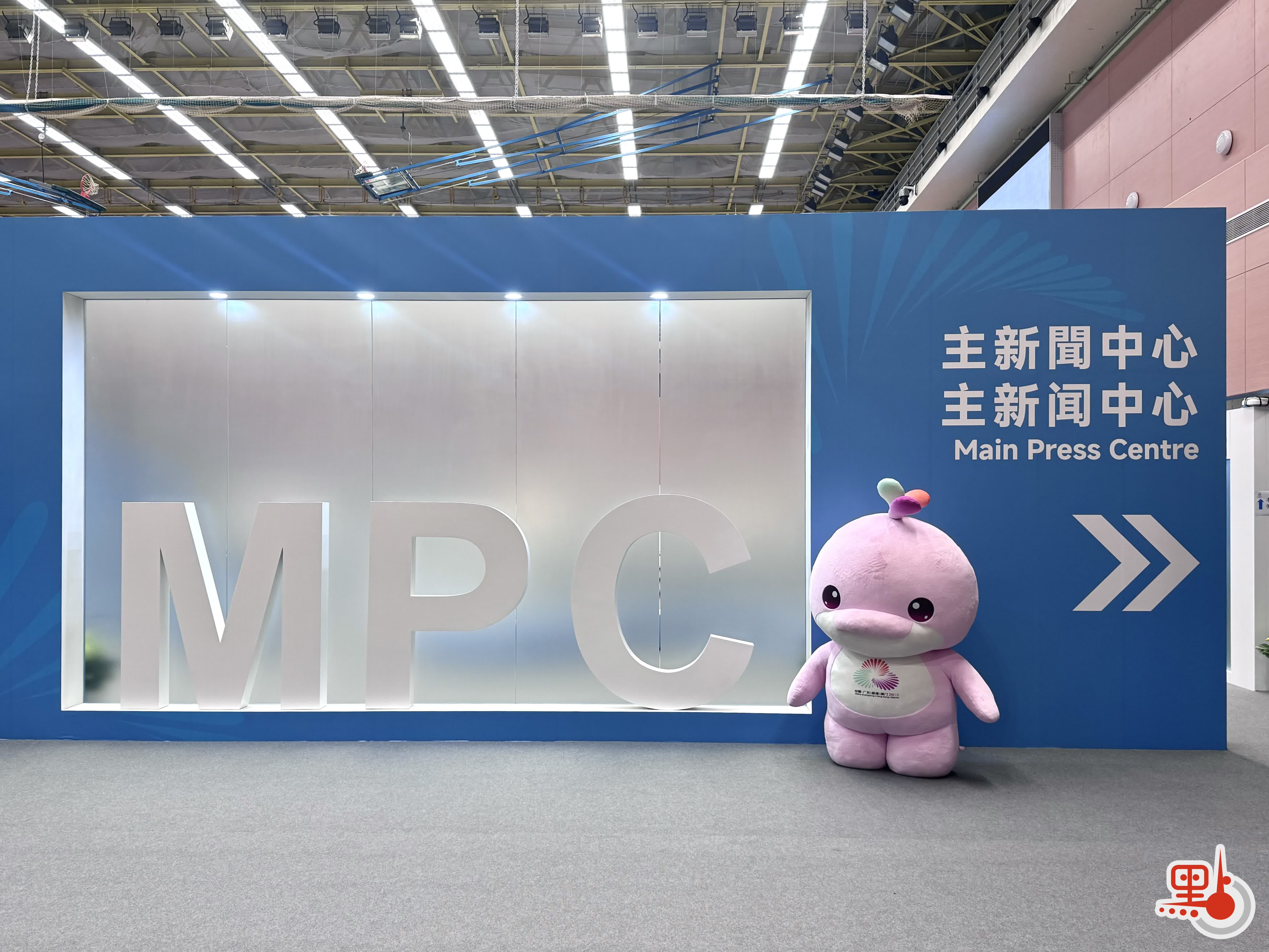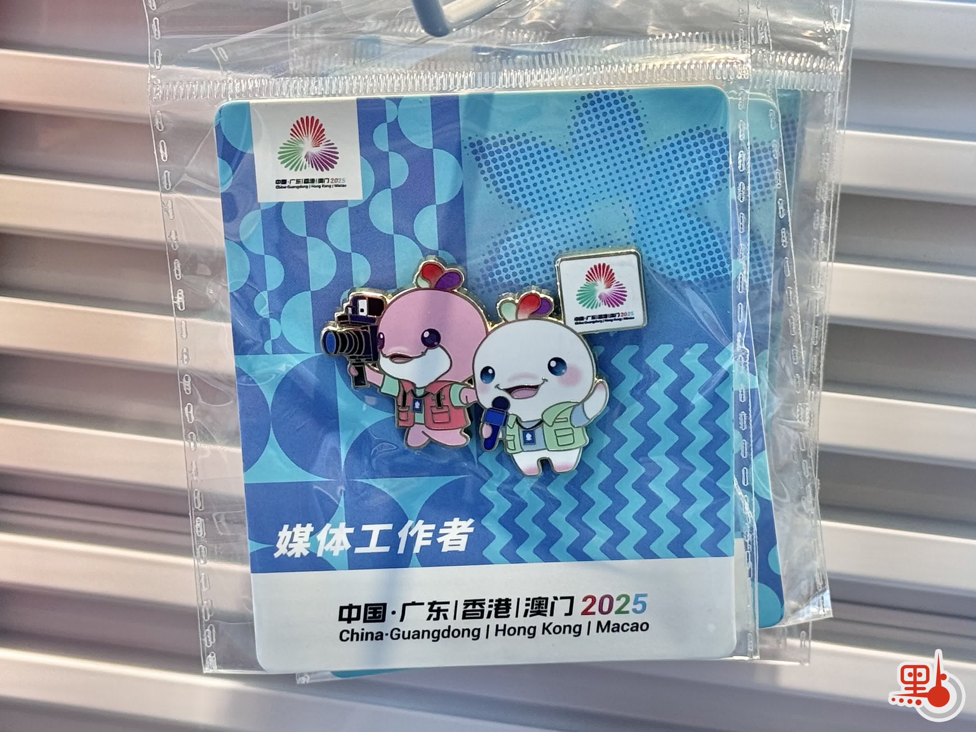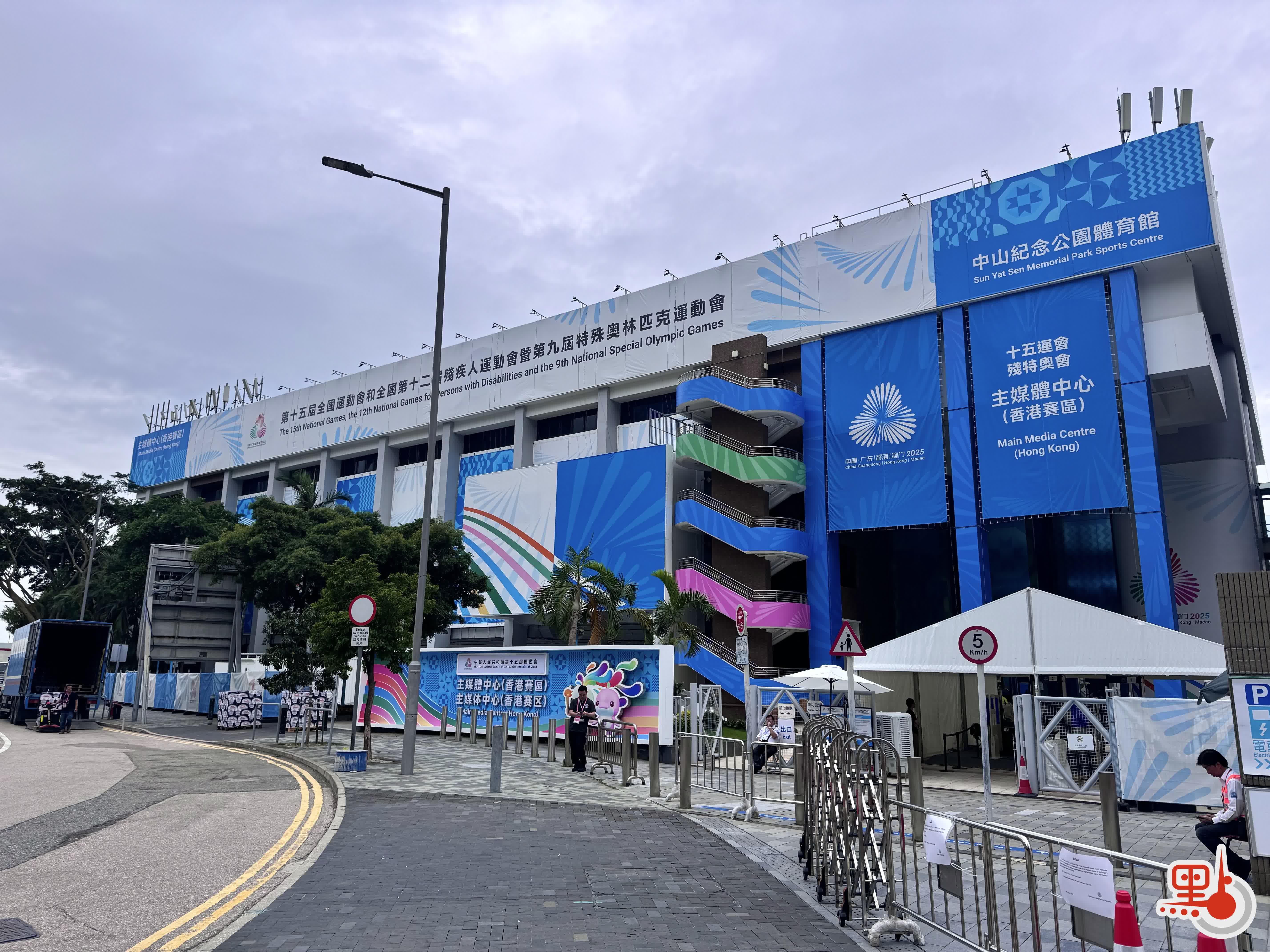 踏入中山紀念公園體育館的瞬間,藍白色標識——「主媒體中心(香港賽區)」吸引我的目光,門口的全運會吉祥物也彷彿微笑着歡迎我的到來。最直觀的驚喜從安檢環節開始,智能人臉識別系統讓效率大幅提升,記者只需站在指定區域,即可「刷臉」通過。這種科技感十足的體驗,令我感受到賽事的專業與嚴謹。此外,安檢處還有人類的好夥伴——警犬值班,真是安全感倍增!