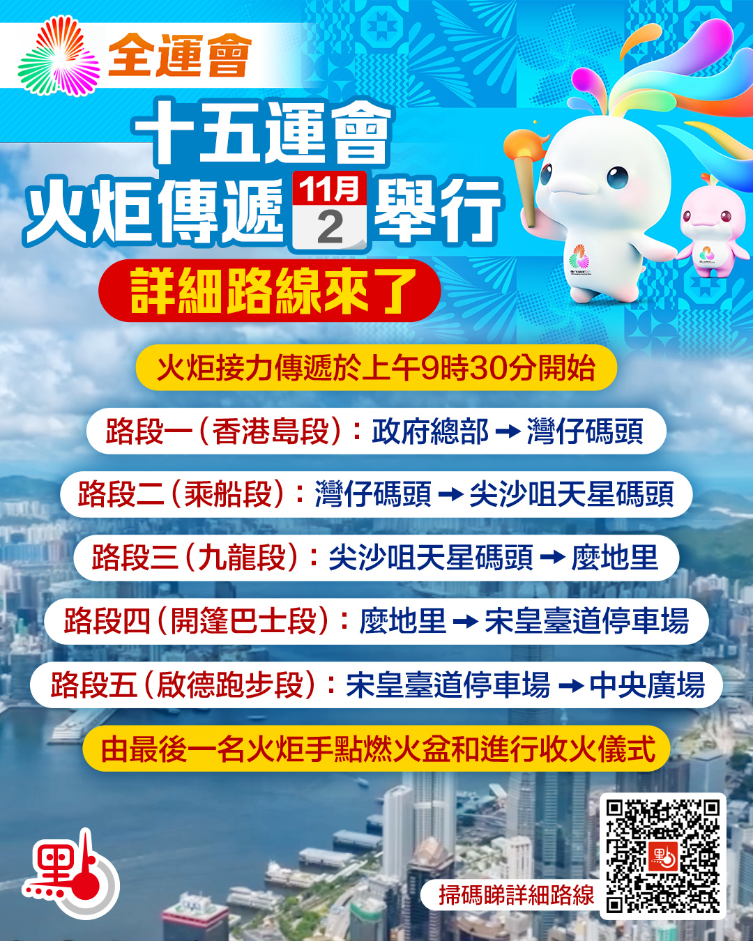 香港的火炬傳遞於11月2日上午9時30分開始,路線全長約10公里,共分為五段,其中跑步距離約佔3.8公里。