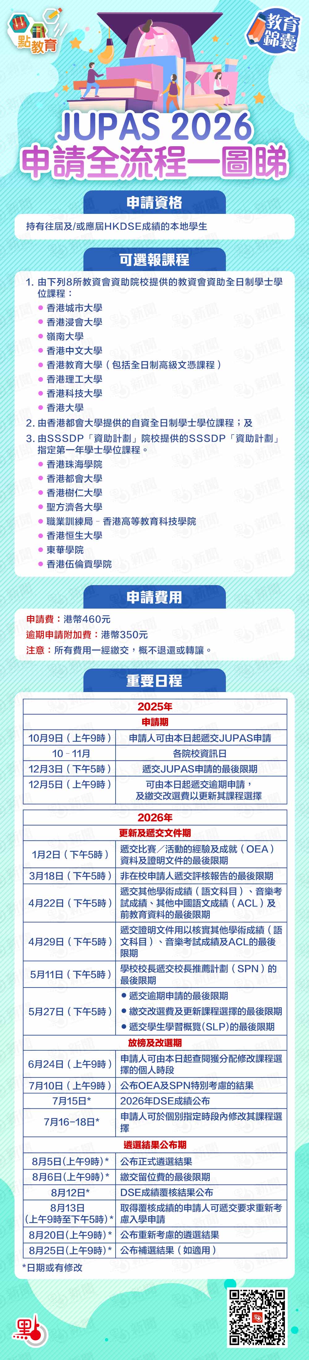 【點新聞報道】各位DSE考生注意,2026年「大學聯招辦法」(JUPAS)申請程序已經啟動!面對繁雜的程序和眾多日期,你是否感到緊張和迷惘?點教育整理實用懶人包,涵蓋申請資格、可選報課程、費用及重要日程等關鍵資訊。立即收藏這份攻略,即可輕鬆掌握整個申請流程!