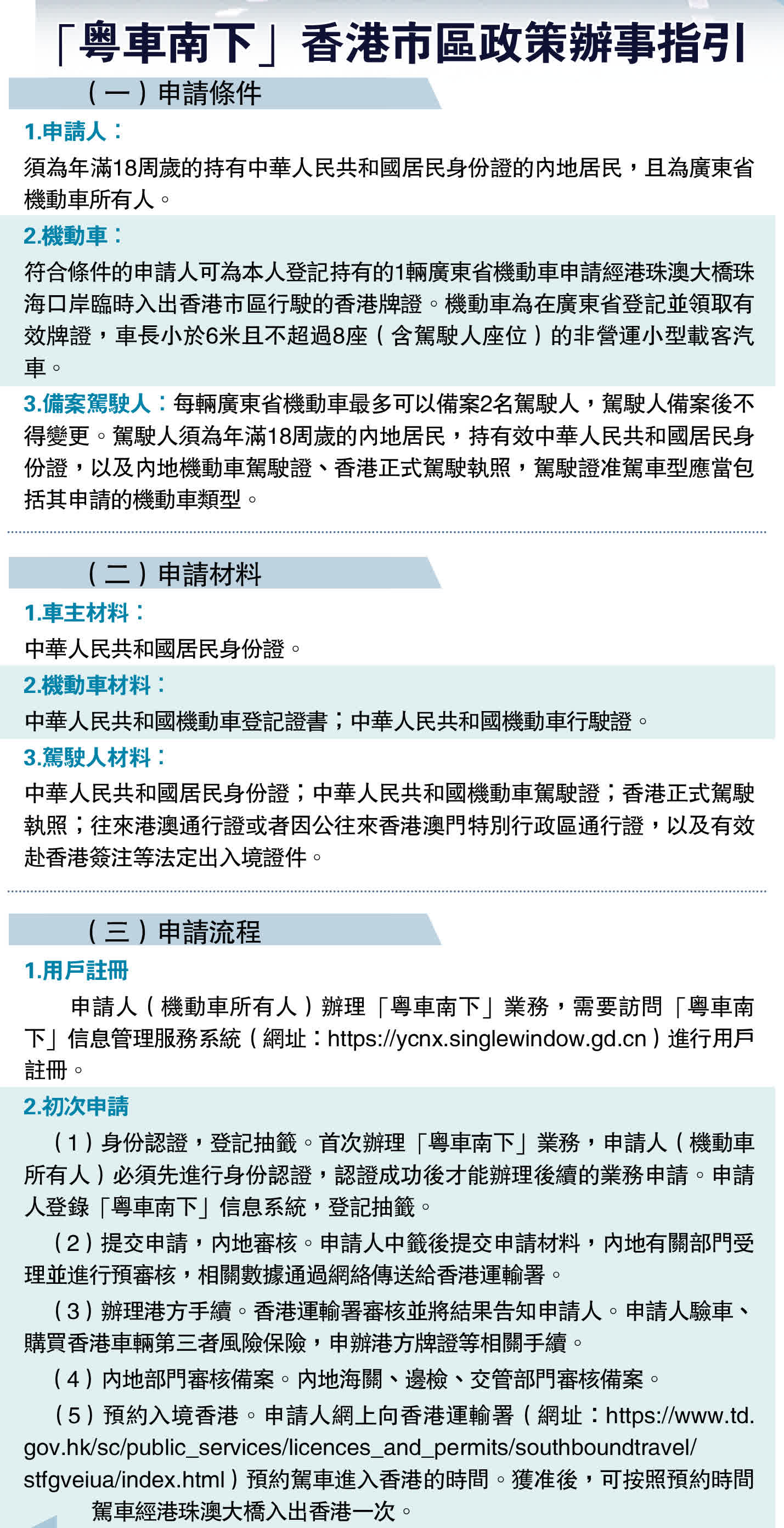 廣東省公安廳、廣東省交通運輸廳10月31日公布「粵車南下」香港政策,申請門檻低、申辦手續簡化便捷等成為亮點。
