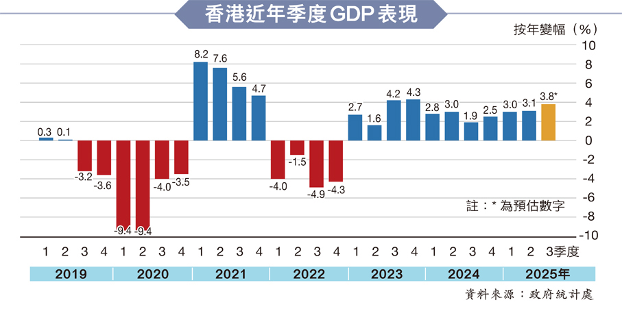 香港經濟進一步好轉,特區政府統計處昨發布第三季的本地生產總值(GDP)預估數字,按年同比升3.8%,連升第11個季度,較第二季的升3.1%加快,遠高過市場預期的升3%,也是自2023年第4季升4.3%以來、即第7個季度最高。經季節性調整的第三季經濟按季增長加快0.3個百分點至0.7%,市場原先預期為倒退0.2%。特區政府指出,第三季經濟增長加快,主要受惠出口、旅遊、股市、消費、樓市、整體投資開支等的增長加快。上述發展勢頭料將持續,支持本港經濟在今年餘下時間進一步穩健增長。