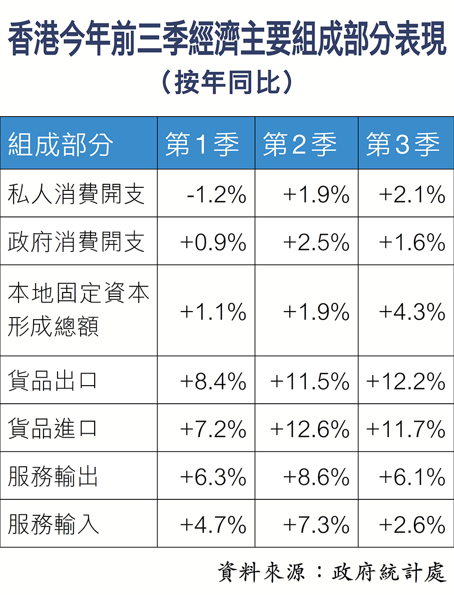 大新金融集團首席經濟及策略師溫嘉煒昨日亦分析指出,本港第三季經濟增長加快並勝預期,主要由於出口、固定資本形成及私人消費開支增速均加快所推動。商業投資加快和樓市成交上升,可能是推動投資表現改善的主因。季內股市暢旺及樓市回穩亦助提振消費氣氛,亦支持私人消費開支改善。