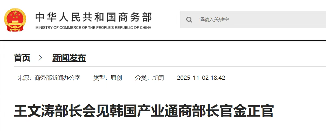 【點新聞報道】據商務部網站消息,11月1日,商務部部長王文濤在韓國慶州會見韓國產業通商部長官金正官。雙方就維護產業鏈供應鏈穩定、加強區域及多雙邊合作等交換意見。