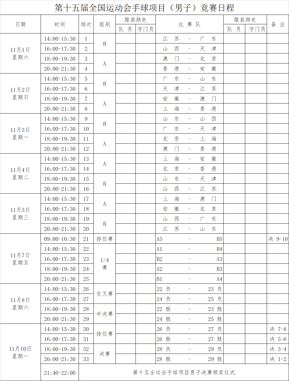 香港隊會在11月1日至3日每日晚上8時分別對陣安徽隊、上海隊和澳門隊,以及於11月4日下午4時對陣北京隊。