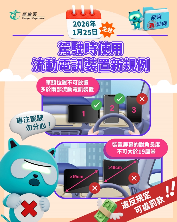 運輸署指,在平衡運輸業界的需要及科技發展等考慮,明年1月25日起,任何司機駕駛時不可在前方放置多於兩部流動電訊裝置,即流動電話、平板或手提電腦,而有關裝置的屏幕對角長度不可超過19厘米。流動電訊裝置不能阻礙司機目視道路及交通情況,以及對觀察路況用的鏡、裝置或攝像顯示器的視線。違反上述規定的司機最高可判處罰款2,000元。