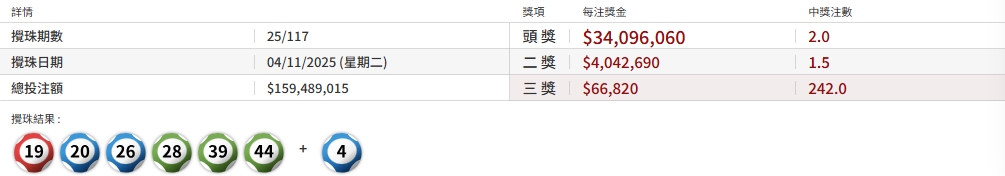 頭獎2注中,每注派彩34,096,060港元;二獎1.5注中,每注派彩4,042,690港元;三獎242注中,每注派66,820港元。