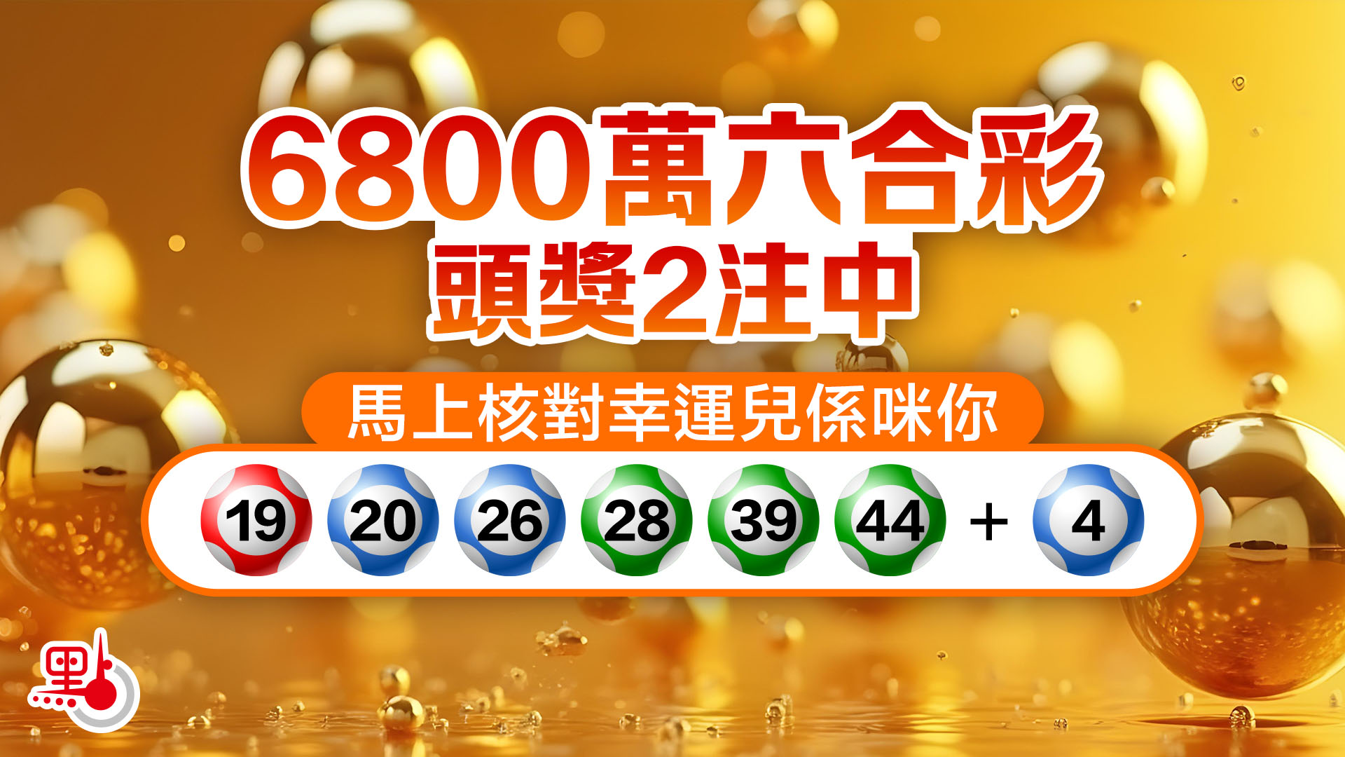 【點新聞報道】頭獎6800萬六合彩今晚(4日)攪珠,攪珠結果為19、20、26、28、39、44,特別號碼4。