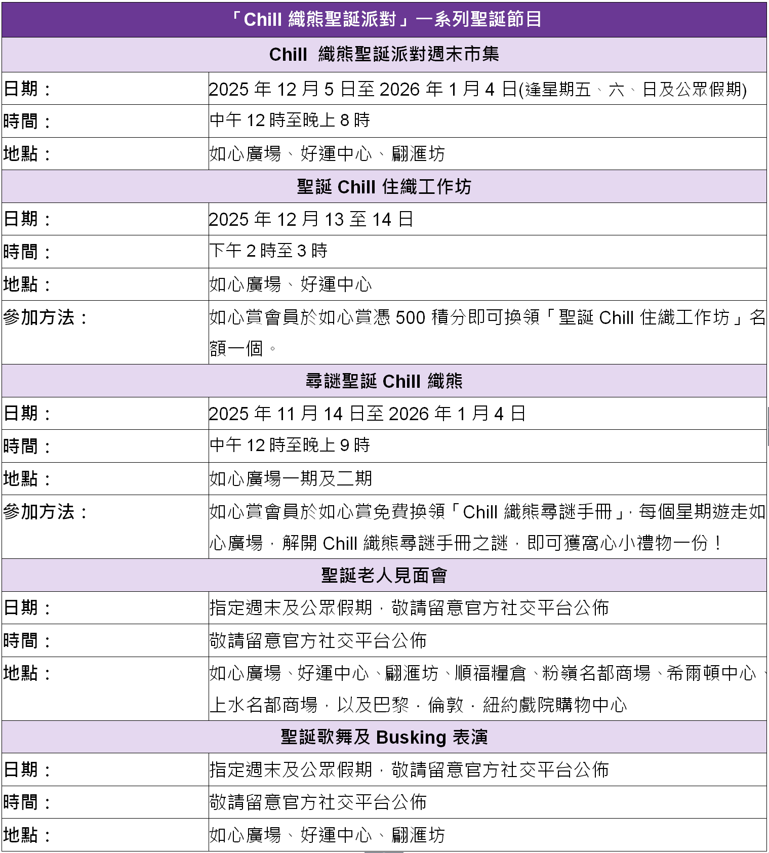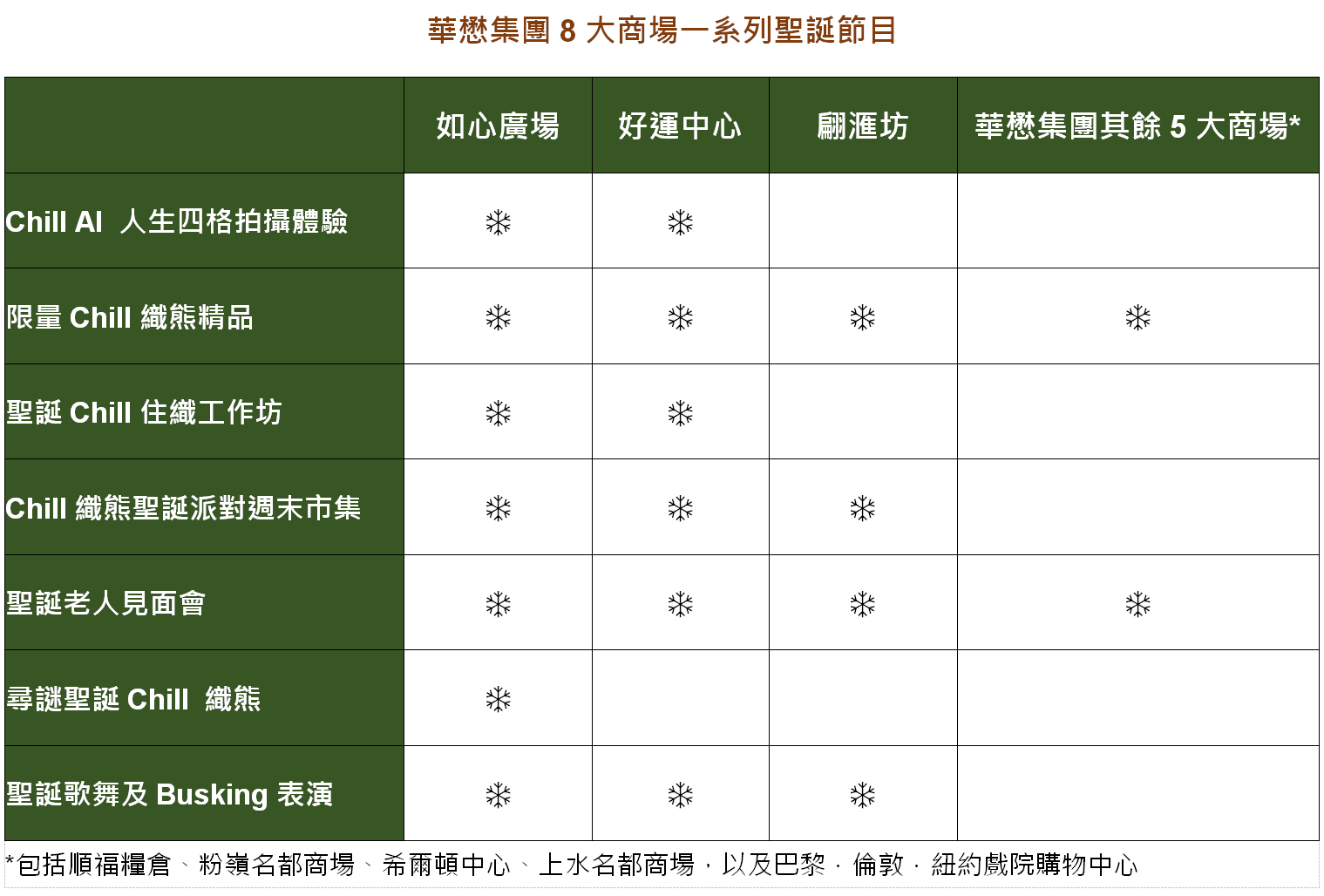 Chill織熊出沒注意!華懋集團3大人氣地標荃灣如心廣場、沙田好運中心、將軍澳翩匯坊聯同5大商場希爾頓中心、順福糧倉、粉嶺名都商場、上水名都商場及巴黎・倫敦・紐約戲院購物中心攜手呈獻首個「Chill織熊聖誕派對」,由11月14日起至1月4日期間,多隻集暖笠笠與軟綿綿於一身的Chill織北極熊公仔,帶動全城浪漫過節!