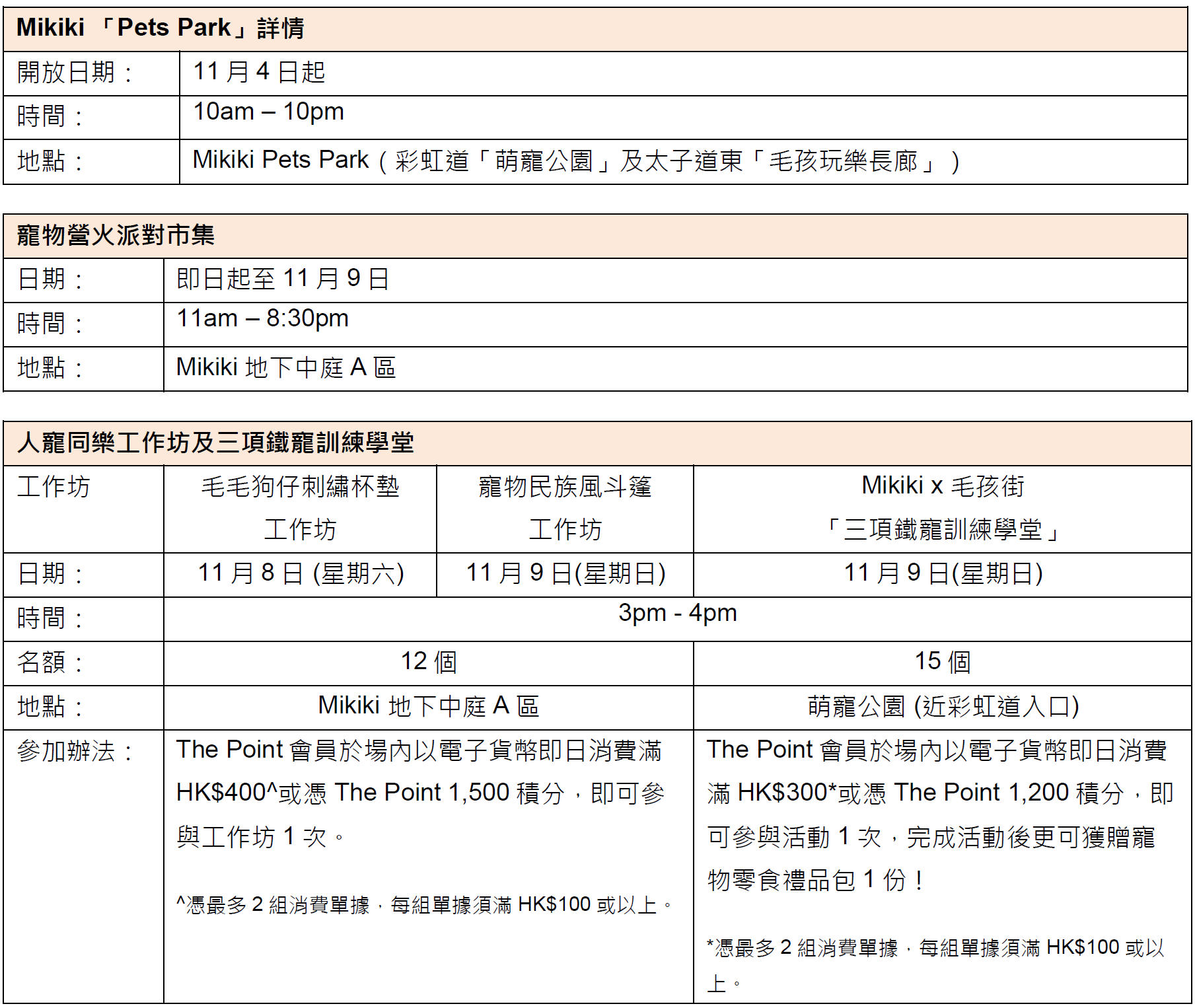 為慶祝Mikiki Pets Park開幕,Mikiki更特別舉辦連串精彩活動,包括有「寵物營火派對」市集、「寵愛禮遇」消費獎賞、「人寵同樂工作坊」及「三項鐵寵訓練學堂」,歡迎各位寵主帶同毛孩到場玩樂及參與!