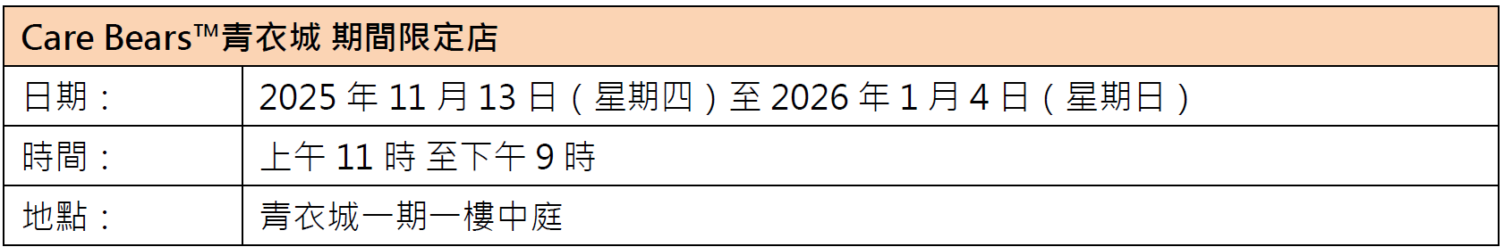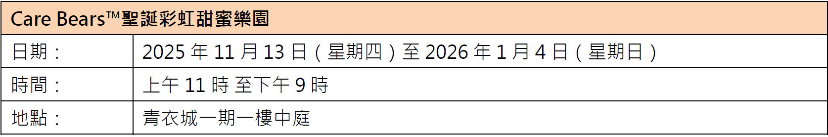 青衣城今個聖誕打造全港首個「Care Bears聖誕彩虹甜蜜樂園」!由2025年11月13日起至2026年1月4日,一同進入夢幻世界,體驗被甜品治癒心靈的神奇力量!今個聖誕,一眾人見人愛的Care Bears降臨青衣城,特別打造全新甜點主題裝置,其中最矚目的必定是6.5米高超巨型Cheer Bear聖誕蛋糕及5米高的「彩虹馬卡龍聖誕樹」打卡位!更有5大人氣角色Cheer Bear、Friend Bear、Love-a-Lot Bear、Share Bear和Wish Bear換上不同聖誕造型,穿梭於場內每個甜品角落,投入Care Bears的繽紛世界!