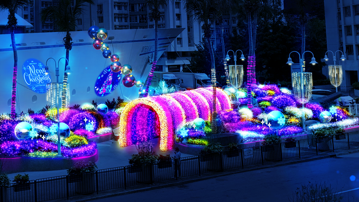 「THE WHISHPHERE@THE WHAMPOA」以聖誕、音樂與電影為靈感主軸,於黃埔號打造多個絢麗打卡熱點——從閃耀奪目的聖誕樹拱門裝置,到直徑達3米的巨型「幻鏡聖誕星球」、七彩光譜交織的藝術花園、逾12米長的「漫天花之隧道」,再到飄浮雪花點綴的浪漫場景「星霧飄雪光雕」,整個空間化身為一座光影交錯的節日舞台。