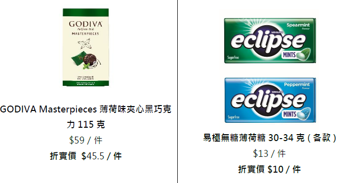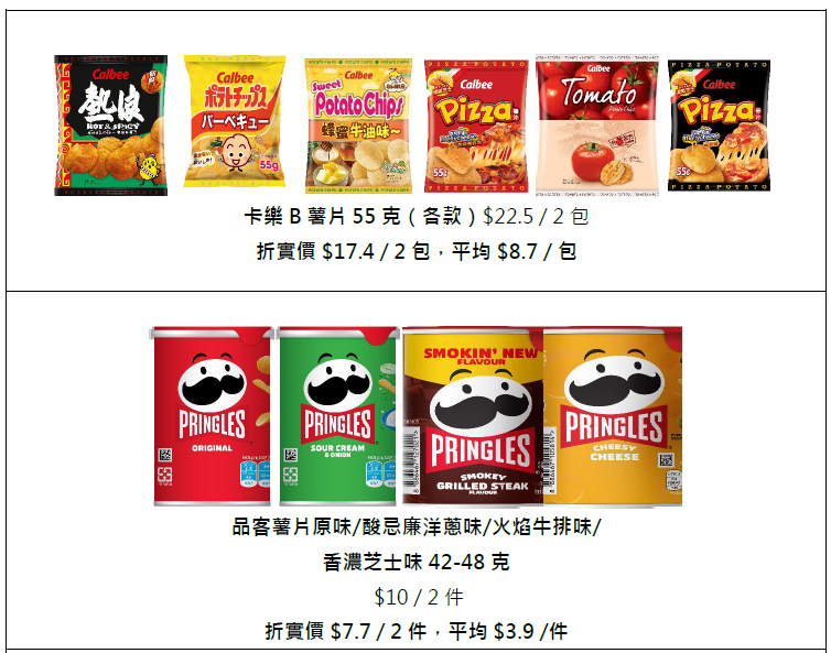 包括:卡樂B薯片、品客薯片,各款香滑的朱古力,及易極無糖薄荷糖等。