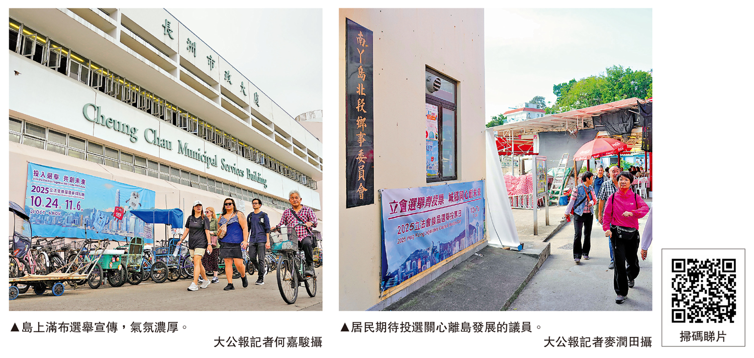 立法會換屆選舉提名期結束,選舉氣氛日趨熾熱。大公報記者連日走訪長洲和南丫島,甫下船,就被碼頭內掛滿的選舉宣傳海報包圍,來到島上街巷、市場,選舉宣傳隨處可見,氣氛濃厚。離島居民關注選舉動向,懷着強烈的民生訴求與期盼,期待投選關心離島發展的立法會議員。