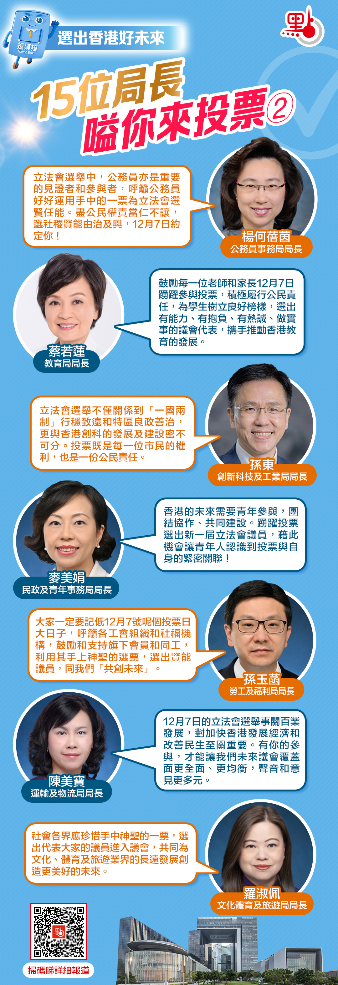 公務員事務局局長楊何蓓茵:立法會選舉中,公務員亦是重要的見證者和參與者,呼籲公務員好好運用手中的一票為立法會選賢任能。盡公民權責當仁不讓,選社稷賢能由治及興,12月7日約定你!