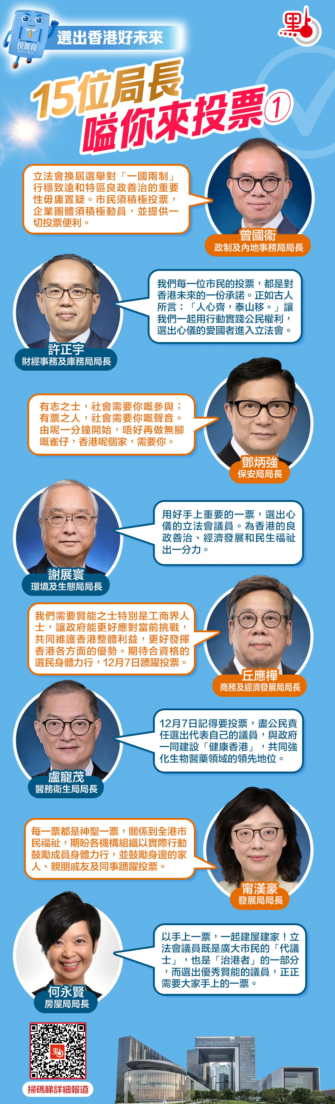 政制及內地事務局局長曾國衞:立法會換屆選舉對「一國兩制」行穩致遠和特區良政善治的重要性毋庸置疑。市民須積極投票,企業團體須積極動員,並提供一切投票便利。