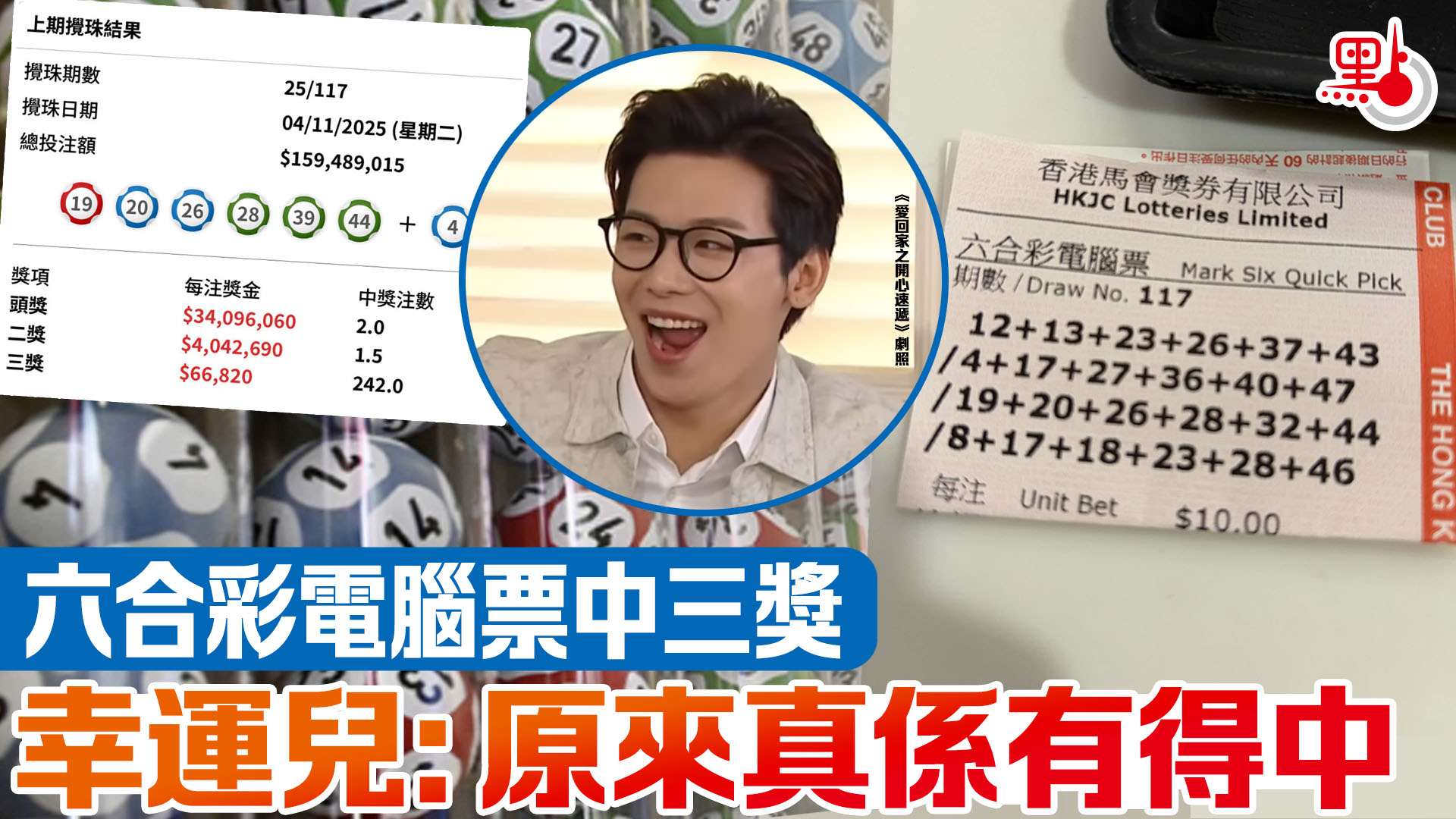 樓主表示,他於屯門市中心的馬會投注站以每注10元合共40元,購買於本周二(4日)開彩的六合彩第117期4條單式電腦票。從其上載的相片可見,其中一條單式中5個字,包括19號、20號、26號、28號及44號,也就是中了三奬。該期六合彩三奬有242注中,每注10元派彩66,820元。