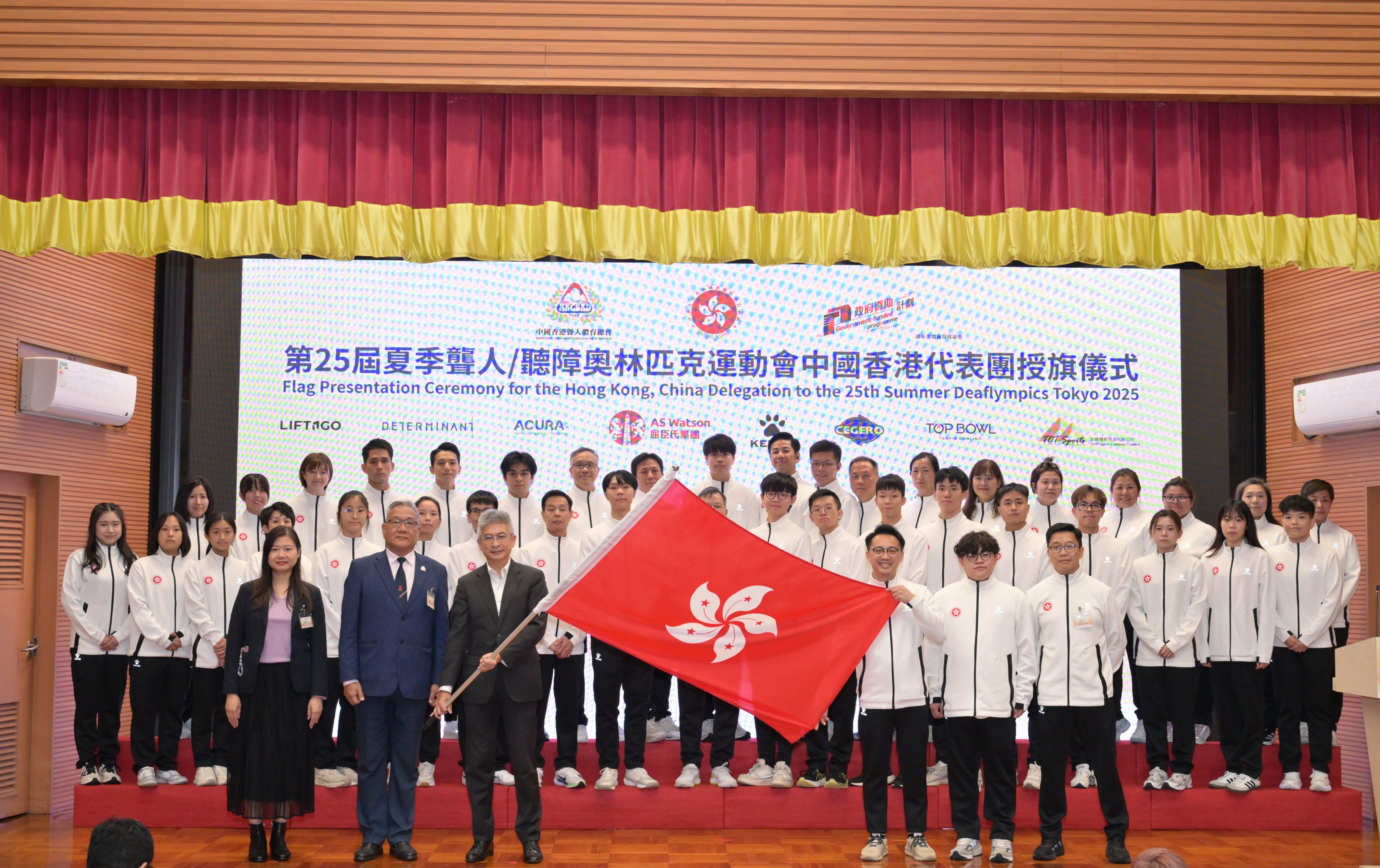 【點新聞報道】中國香港聾人體育總會(簡稱聾體會)今日(7日)於路德會啟聾學校禮堂舉行「第25屆夏季聾人/聽障奧運會中國香港代表團授旗儀式」。文化體育及旅遊局副局長劉震、體育委員會精英體育事務委員會主席鄭景亮等擔任主禮嘉賓,聯同一眾嘉賓為授旗儀式掀開序幕,亦為即將出戰11月下旬於東京舉行的聾人/聽障奧運會(Deaflympics)的中國香港代表團運動員加油打氣。