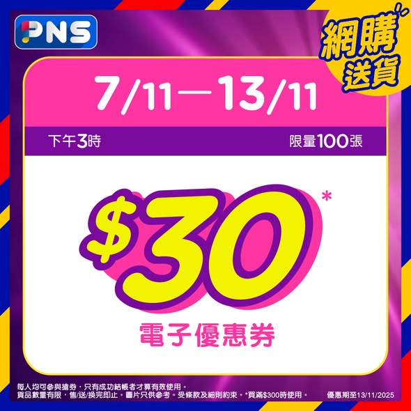 $30電子優惠券:買滿$300並使用網購送貨即減$30,每日下午3時準時開搶,限量100張