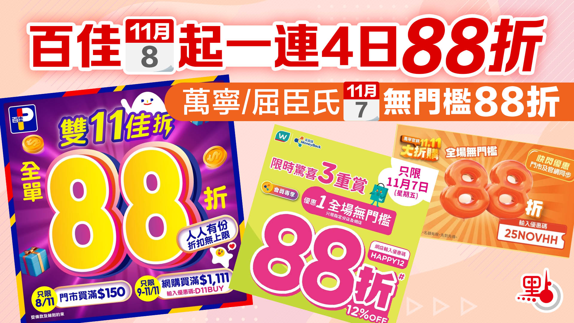 百佳宣布推出一連4日的88折優惠活動,11月8日(星期六)為門市限定,於任何一間百佳門市購物滿$150即享88折;11月9日至11日(星期日至二)為網購限定,於PNS網購平台買滿$1111,輸入優惠碼【D11BUY】即享88折。另外,即日起至11月13日,PNS網購每日早上10時及下午3時都會發放電子優惠券,數量有限。