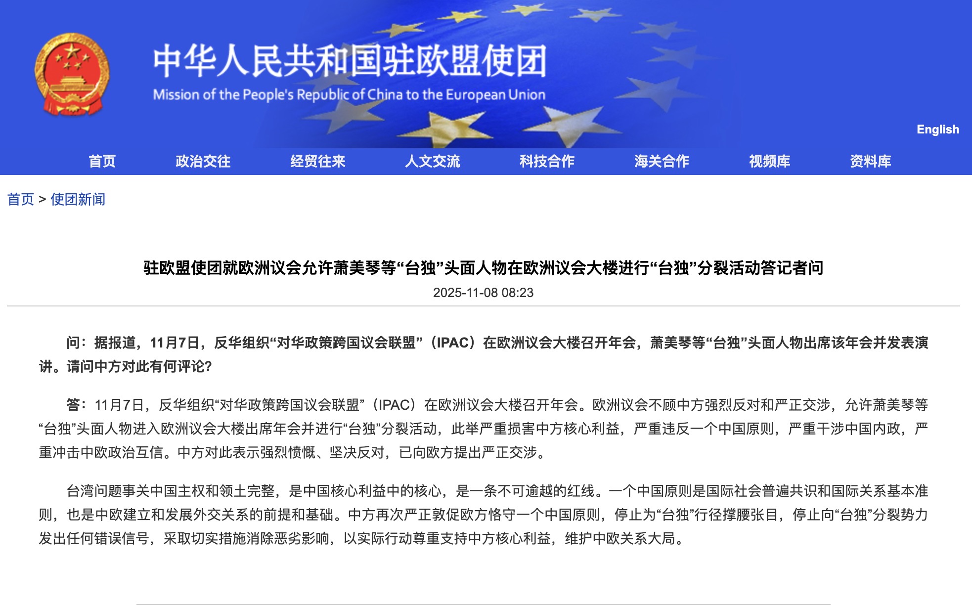 中國駐歐盟使團表示,11月7日,反華組織「對華政策跨國議會聯盟」(IPAC)在歐洲議會大樓召開年會。歐洲議會不顧中方強烈反對和嚴正交涉,允許蕭美琴等「台獨」頭面人物進入歐洲議會大樓出席年會並進行「台獨」分裂活動,此舉嚴重損害中方核心利益,嚴重違反一個中國原則,嚴重干涉中國內政,嚴重衝擊中歐政治互信。中方對此表示強烈憤慨、堅決反對,已向歐方提出嚴正交涉。
