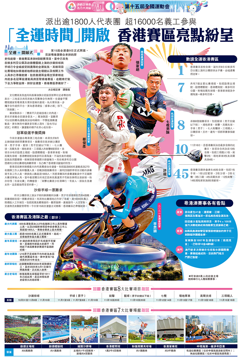第15屆全運會9日正式開幕,見證粵港澳聯合承辦的歷史性創舉。香港賽區承辦8個競賽項目,當中已率先在維多利亞公園及啟德體藝館上演的沙灘排球與手球已令全城感受到濃厚的全運氣氛,其餘項目比賽場地如香港新地標啟德主場館以及相關工作人員亦已準備就緒。包括奧運兩金得主張家朗在內的多名冠軍級運動員將匯聚香港賽區,在觀眾打氣下全力爭取金牌。辦好全運會,香港賽區準備好了。