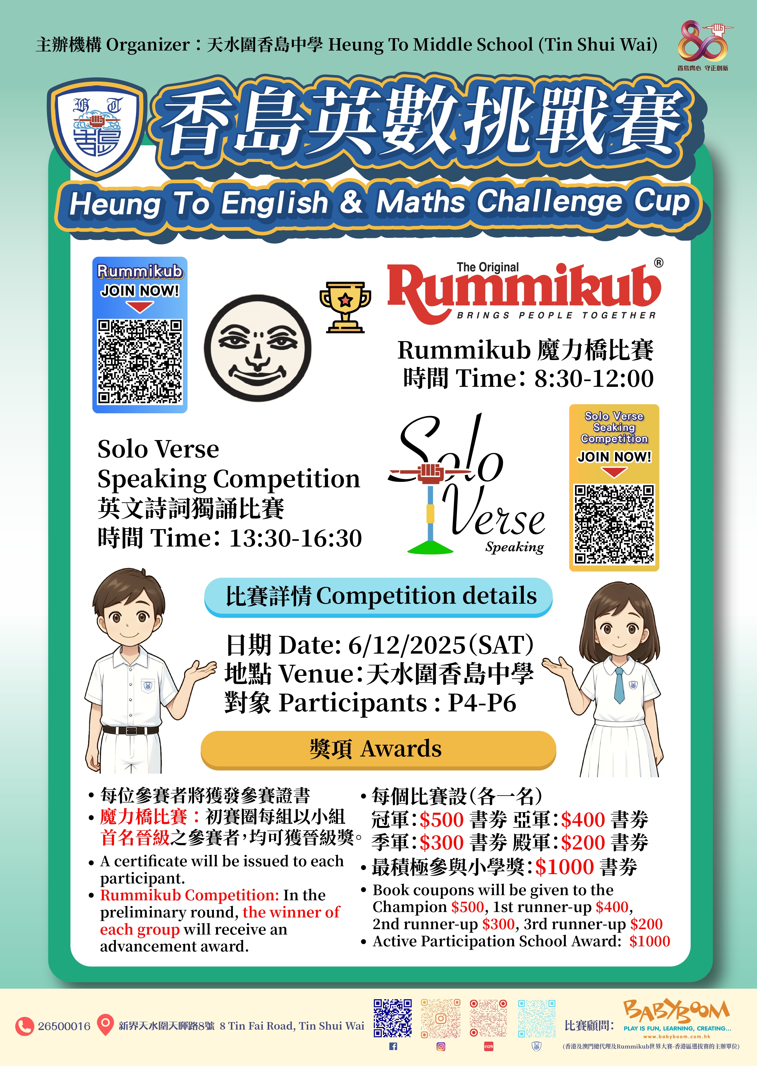 與此同時,為推動學術風氣,本校同日舉辦香島英數挑戰盃(英文詩詞獨誦/數學魔力橋比賽),提供一個互相切磋及交流的機會給高小學生。歡迎小四至小六學生報名參加比賽,發揮個人潛能。家長可以掃瞄海報上的QR CODE為孩子報名,名額有限,先到先得。