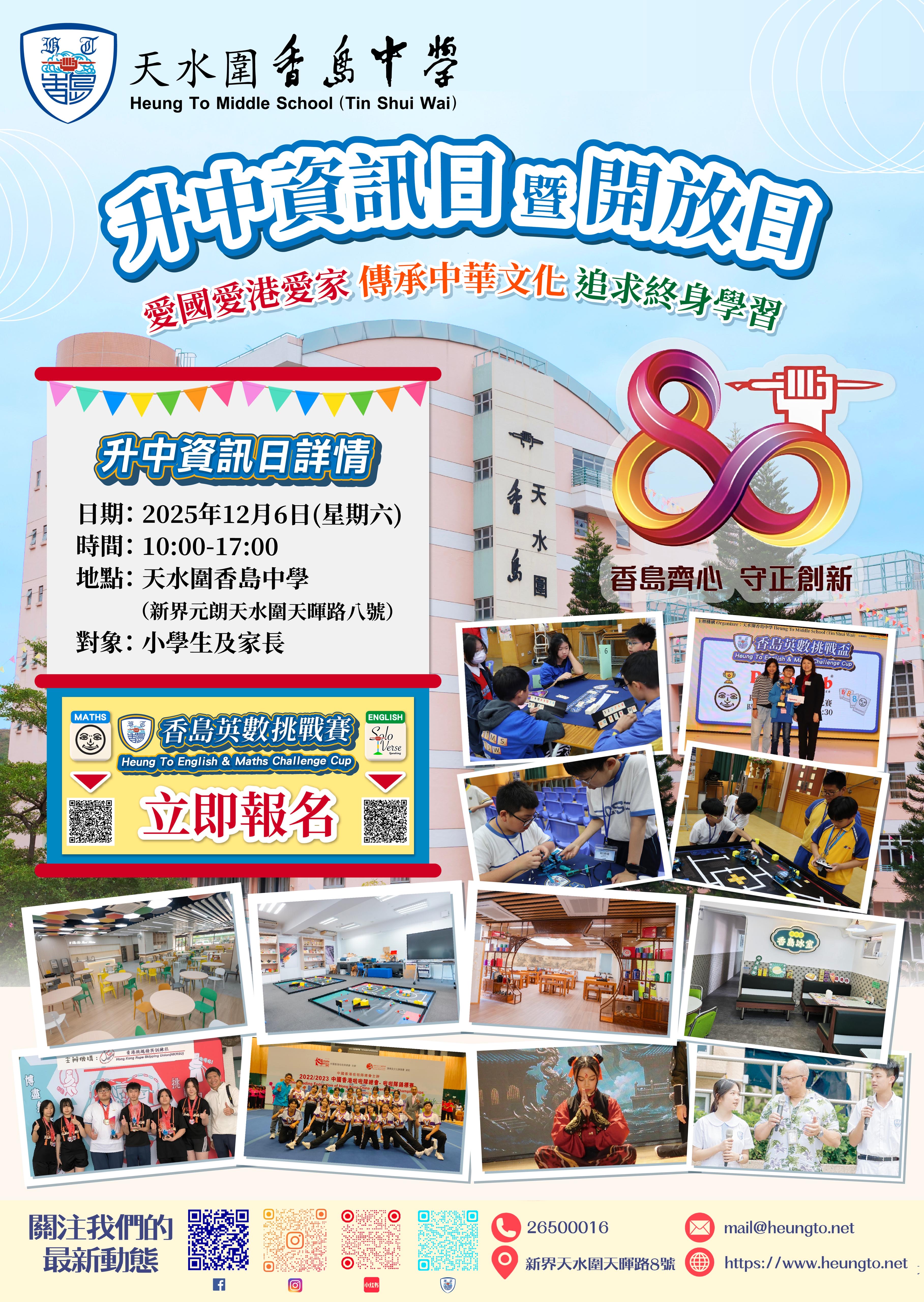 適逢香島教育機構喜迎80周年,為了讓家長及其子弟認識本校校風文化、課程規劃及校舍設備,本校將於2025年12月6日(星期六)舉辦升中資訊日暨開放日。除了校長講座外,學校還提供了豐富有趣的活動讓小學生體驗,例如:中華文化:茶道及華服文化體驗、非遺文化:港式特製飲品體驗、環保水果酵素清潔劑、光敏印章、DIY鐳射切割及和諧粉彩等,相信小學生屆時獲益良多。