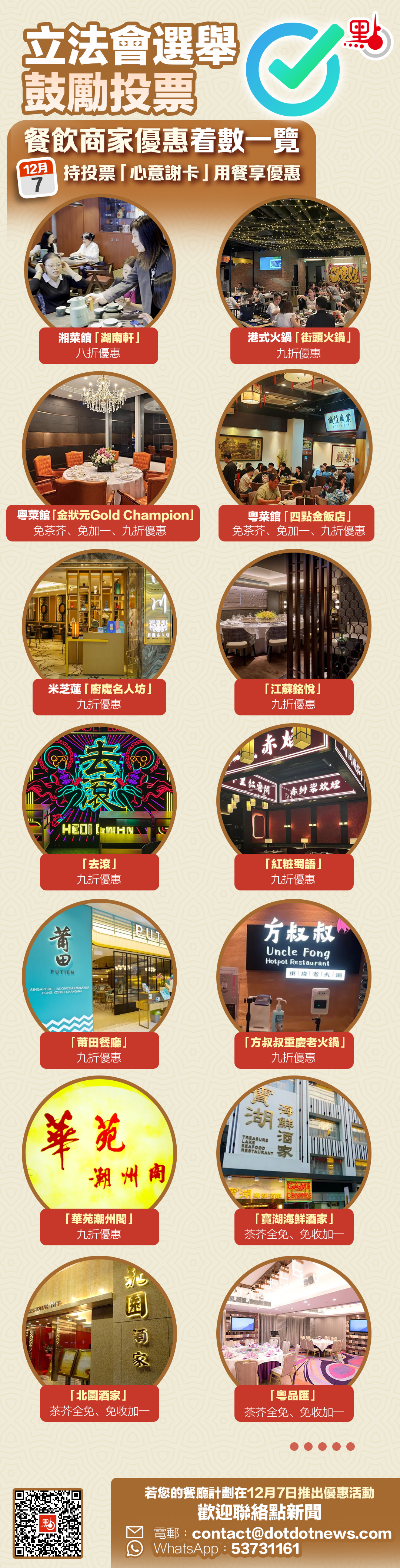 優惠:12月7日立法會選舉當日,憑投票「感謝卡」到店消費,可享免茶芥、免加一服務費、菜品九折優惠(查看餐廳詳情)