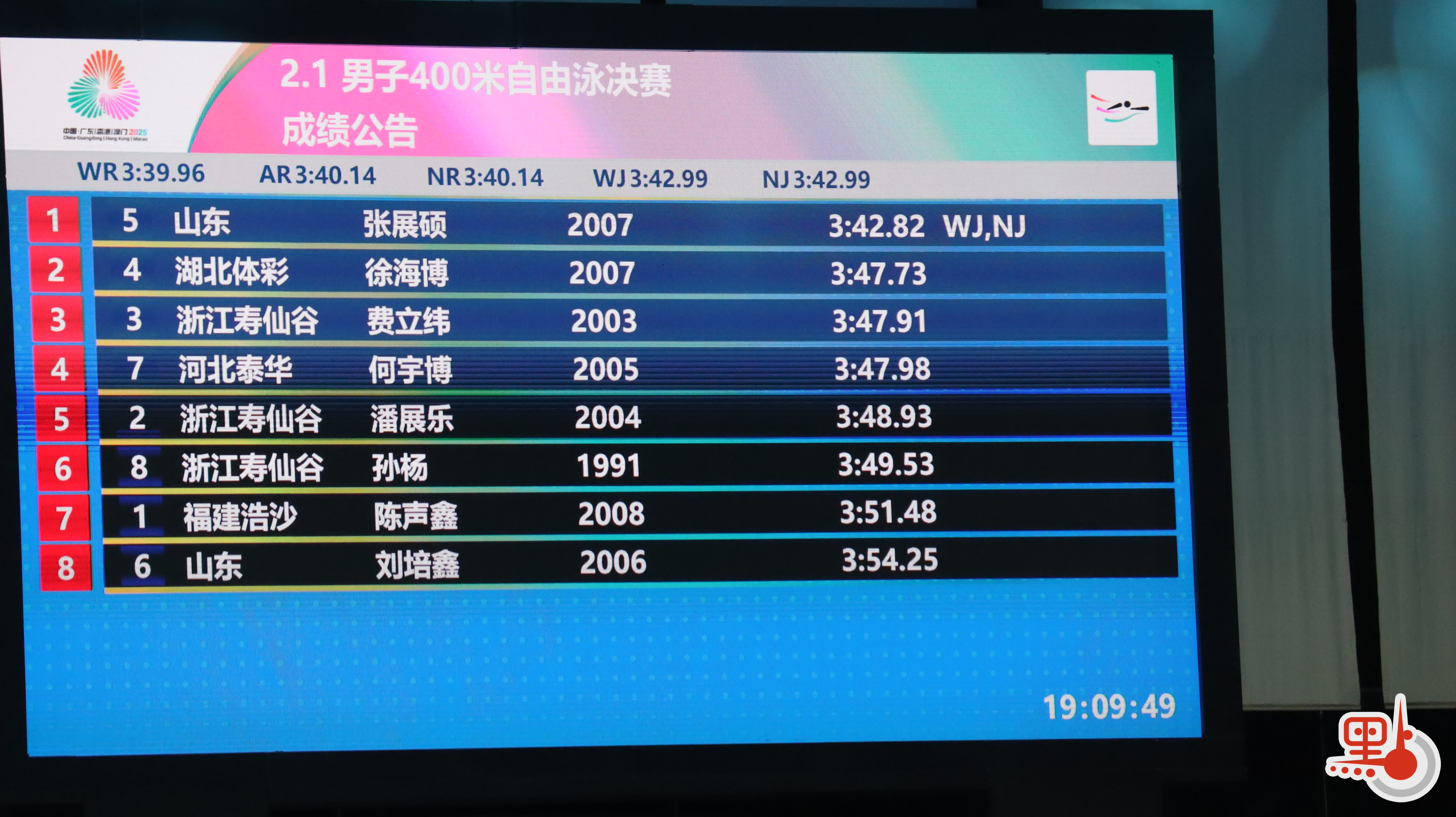 【點新聞報道】11月10日晚,迎來了「神仙打架」的男子400米自由泳決賽,18歲的山東選手張展碩3分42秒82奪得金牌,同時打破世界青年紀錄。湖北隊徐海博第二名,浙江隊費立緯位列第三。潘展樂3分48秒93第五,孫楊3分49秒53第六。