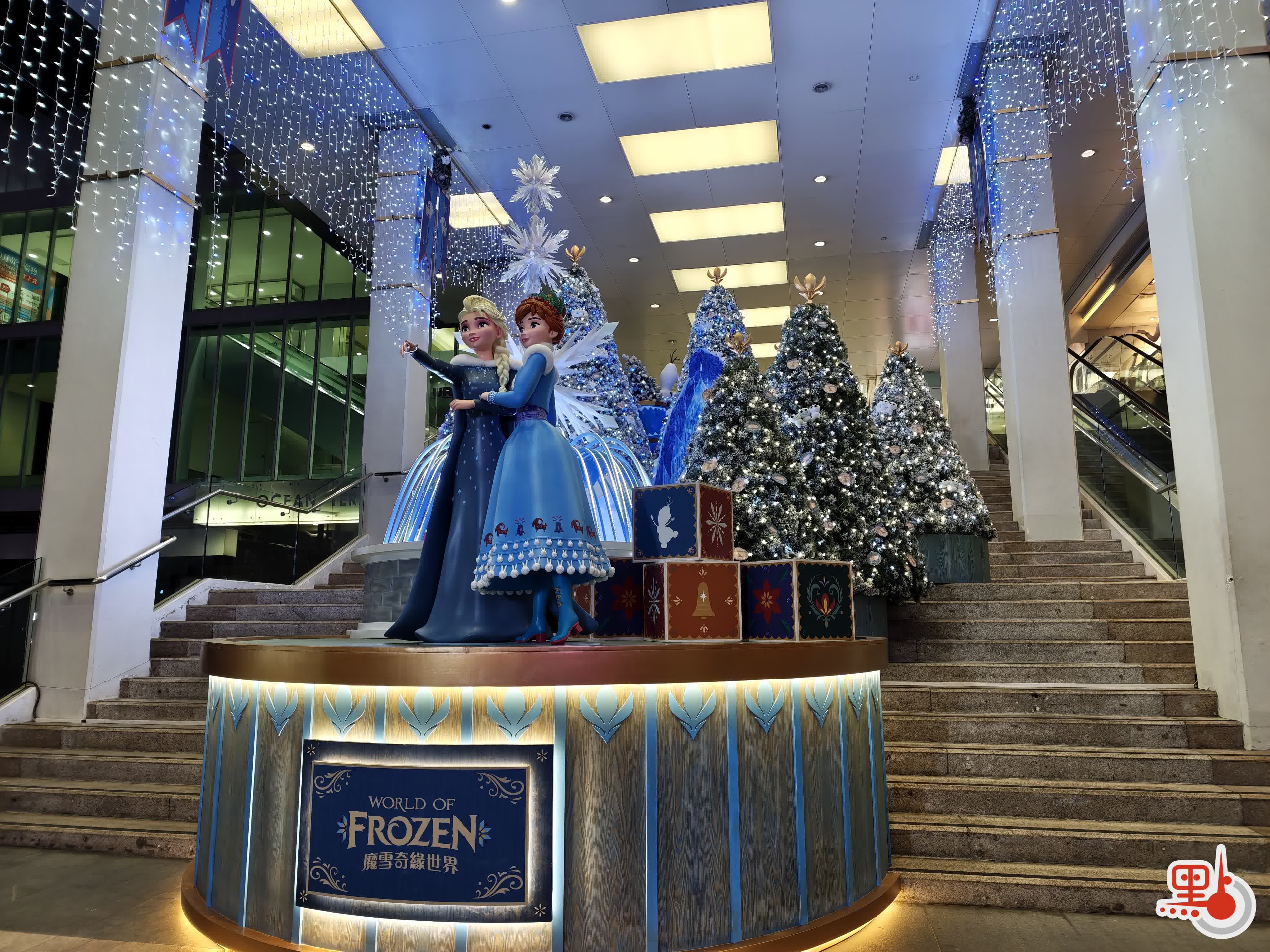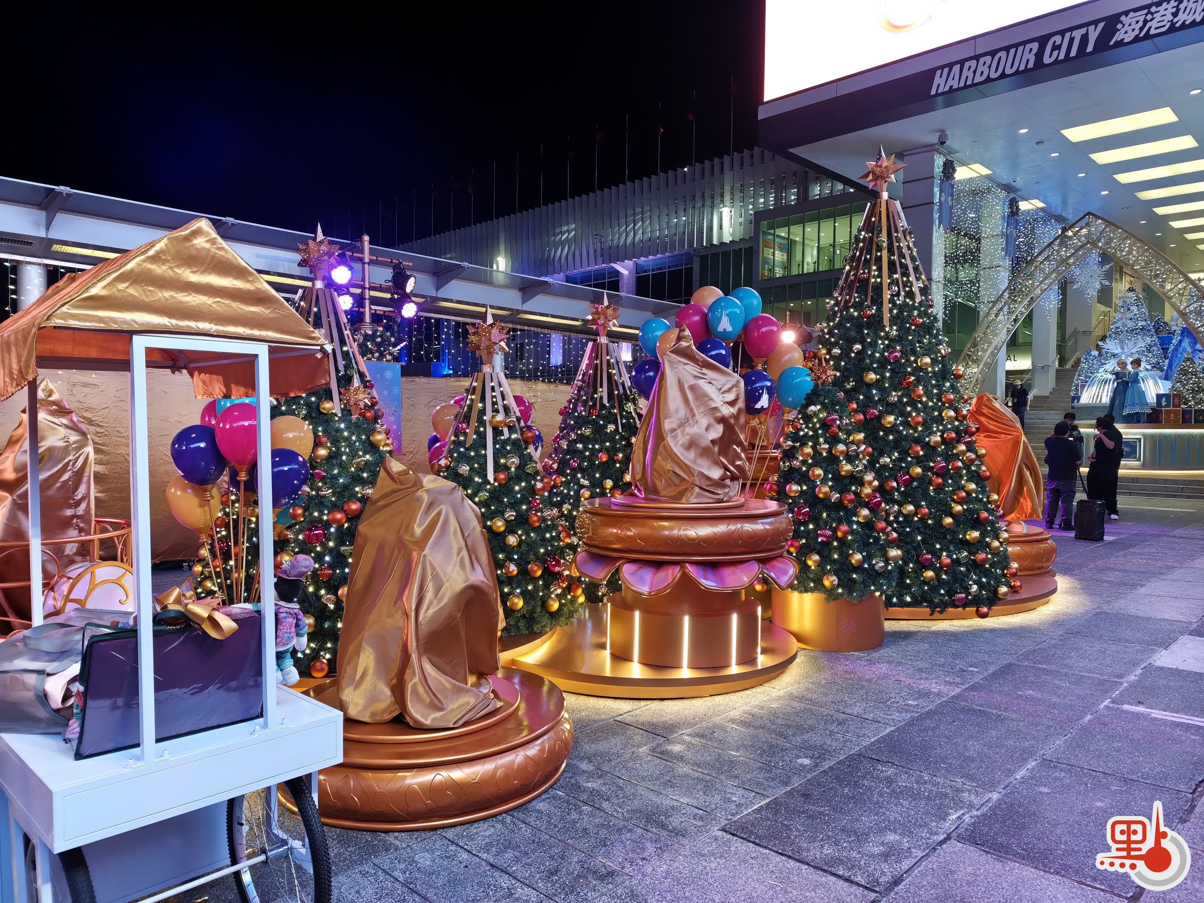 點新聞記者在現場見到,原先空曠的露天廣場已擺放了一組高達9米的大型聖誕樹,兩旁飾以米奇圖案,十分氣派。聖誕樹後方則設有冰雪奇緣、迪士尼好友巡遊派對花車等多個不同主題的聖誕打卡位。廣場兩旁則布滿聖誕彩燈,現場持續播放節慶音樂,節日氣氛濃厚。
