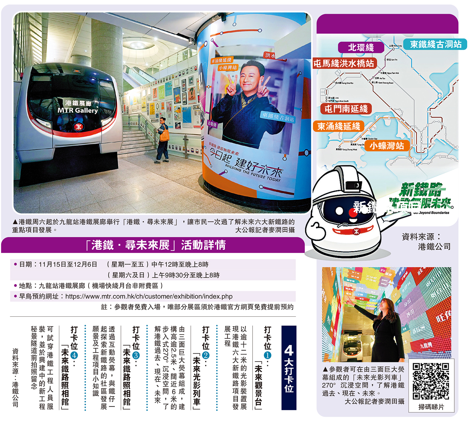 「港鐵·尋未來展」新鐵路光影之旅將於11月15日至12月6日開放公眾參觀,現已開始接受網上預約。展覽設有四大展區,透過不同形式介紹港鐵未來六大新鐵路項目發展。其中「未來觀景台」展現六大新鐵路工程項目的新車站,以及路線連結多個地標,包括古洞站附近的「心形湖」,以及北部都會區等。