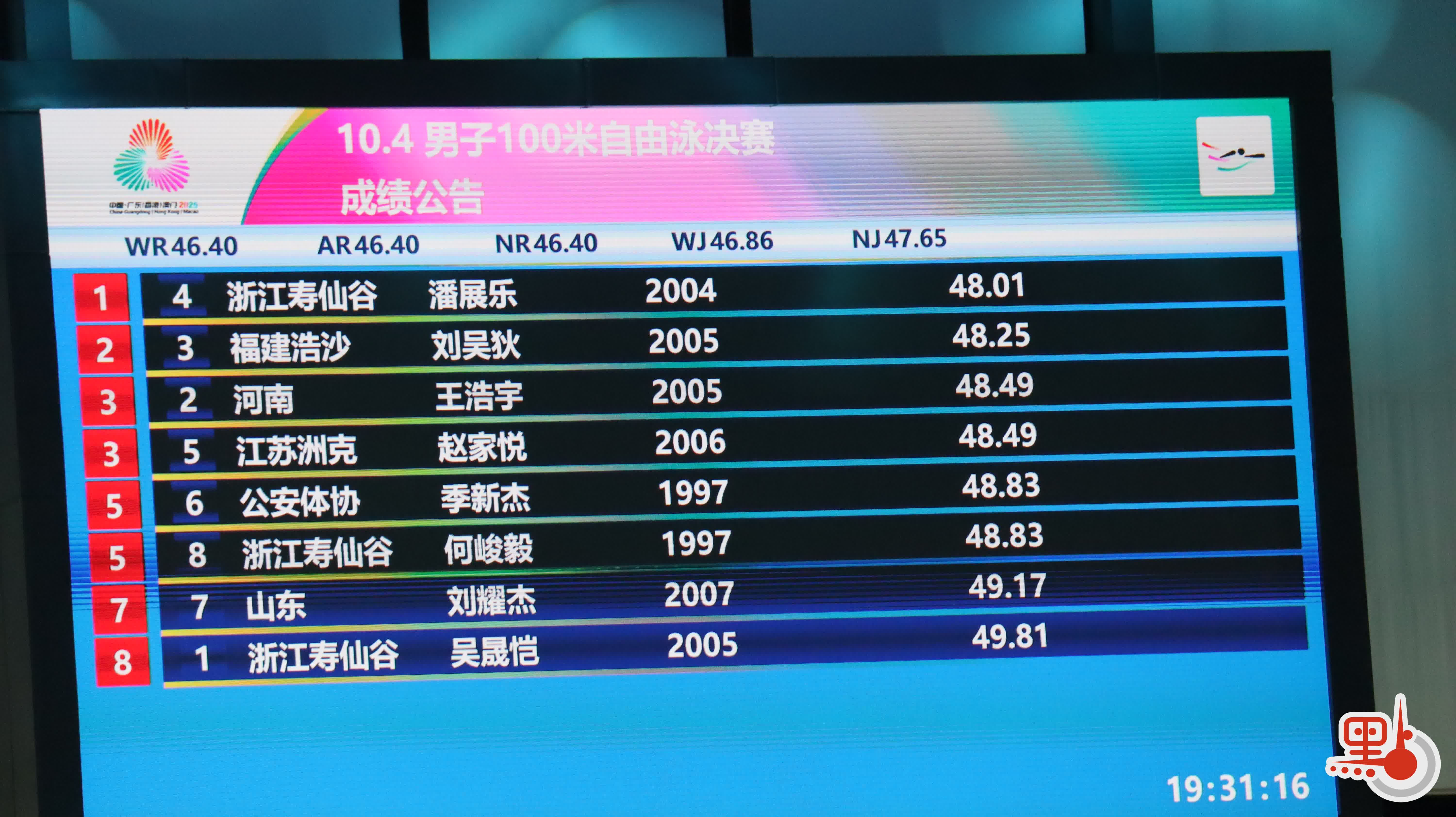 【點新聞報道】今晚(14日),全運會的一大熱門項目當屬男子100米自由泳,浙江隊潘展樂以48秒01的成績奪冠,福建隊劉吳狄以48秒25的成績獲第二名。在本場比賽中,迎來了此次游泳項目的首個並列名次,河南隊王浩宇及江蘇隊趙家悅以48秒49的成績並列第三。