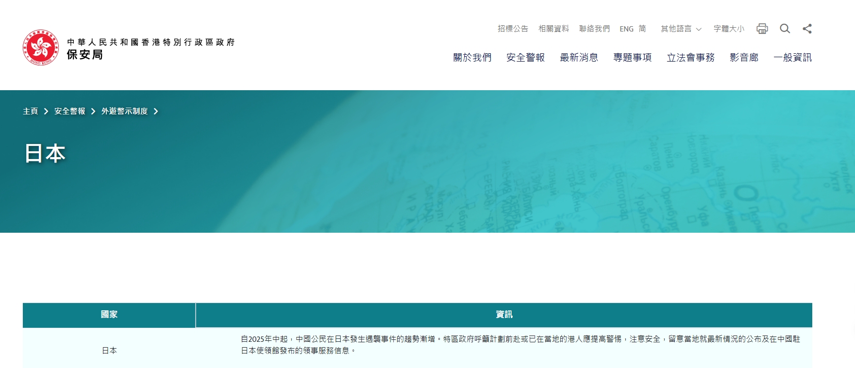保安局更新日本外遊警示資訊 籲港人提高警惕注意安全