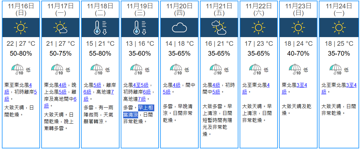 天文台指,今日大致多雲,日間部分時間有陽光,最低氣溫約18度。吹和緩北至東北風,稍後轉吹和緩至清勁東風。周一大致天晴,日間乾燥,晚上漸轉多雲,最低氣溫約21度;周二顯著轉涼,氣溫介乎15至21度,多雲,有一兩陣微雨;至周三氣溫更進一步下跌,早上相當清涼,最低氣溫13度。