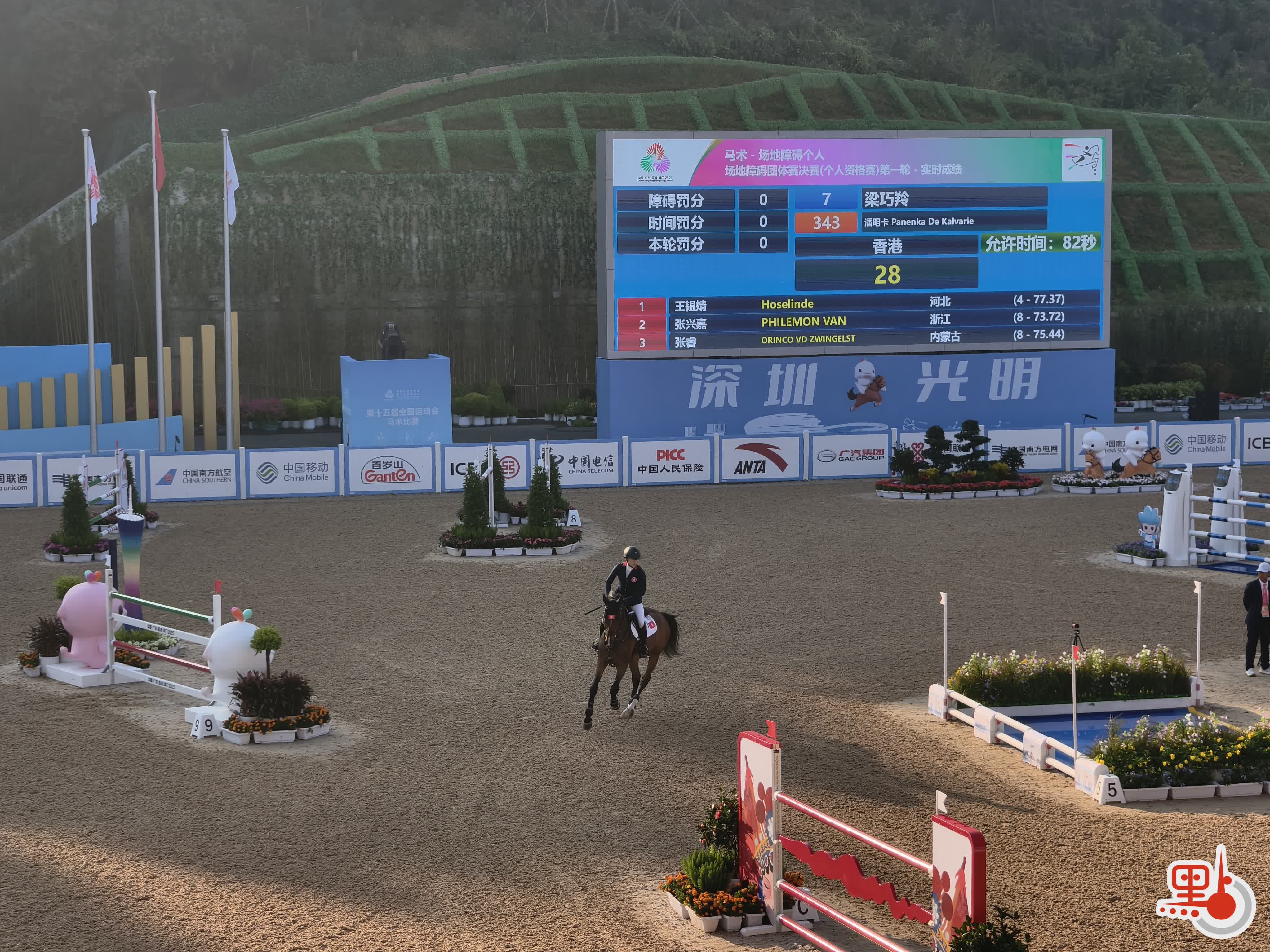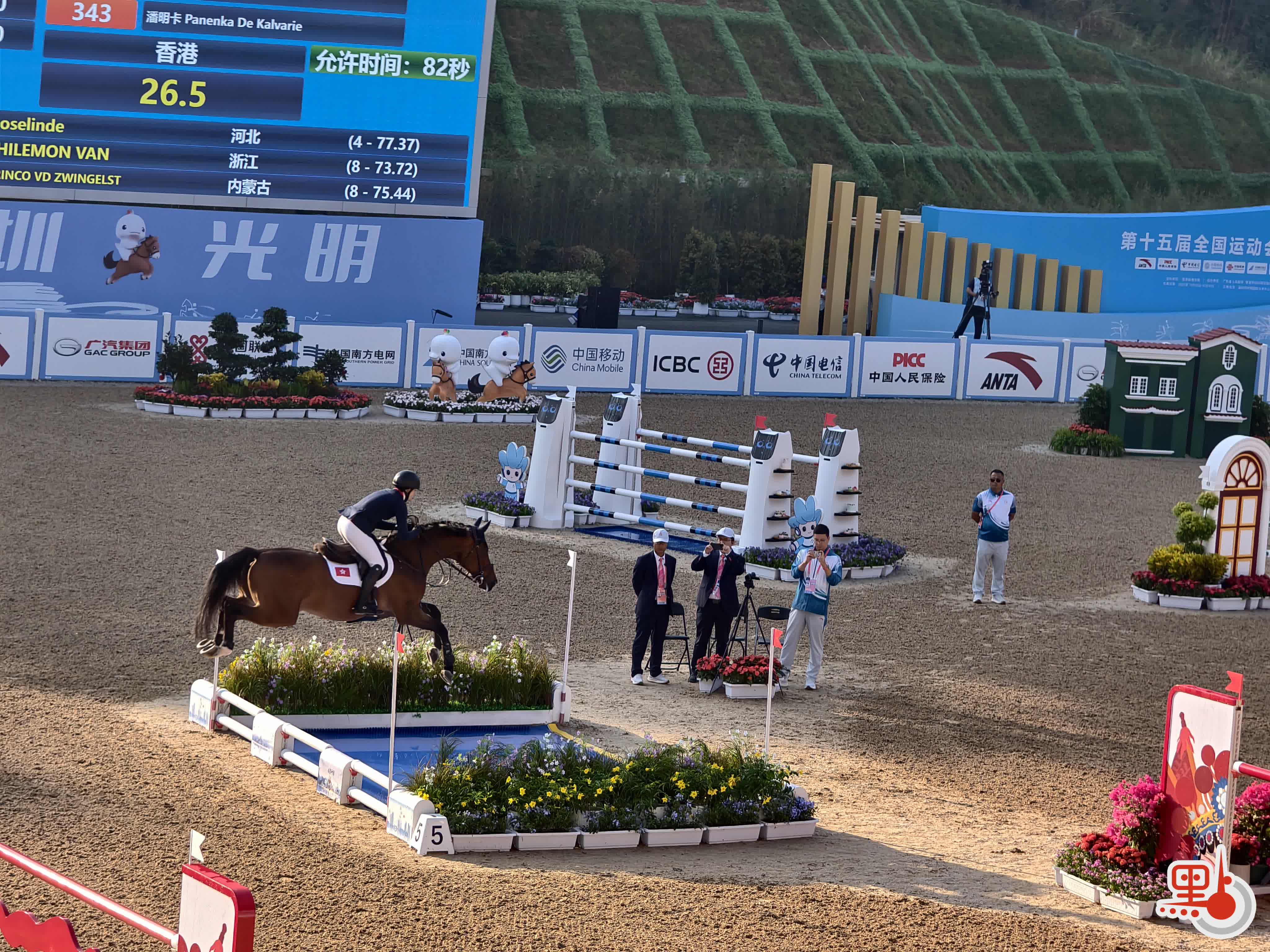 【點新聞報道】11月17日上午,十五運會馬術項目場地障礙團體賽決賽(個人資格賽)第一輪正式開賽。梁巧羚是第一位出場的港隊選手。她的第一輪比賽中,障礙罰分4分,時間罰分0分,在前7個出場選手中排名暫列第二。