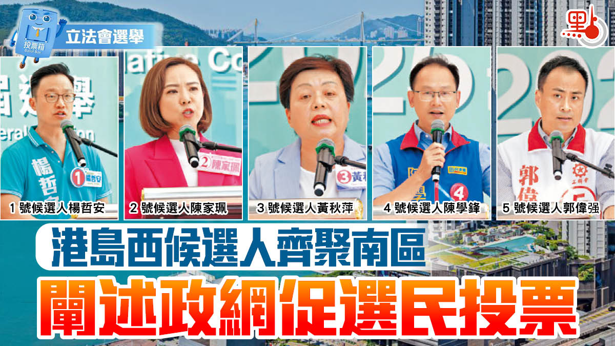【點新聞報道】立法會換屆選舉將於12月7日投票,全港各區近日展開不少大型宣傳。其中港島西候選人南區推介會昨日在香港仔海濱公園舉行,5名候選人楊哲安、陳家珮、黃秋萍、陳學鋒及郭偉强齊聚闡述政綱與政績,他們分別從經濟、城鄉共融、地區建設及勞工權益等多角度提出主張,並呼籲市民於12月7日舉行的第八屆立法會選舉中踴躍投票,以選出為民發聲的代表。